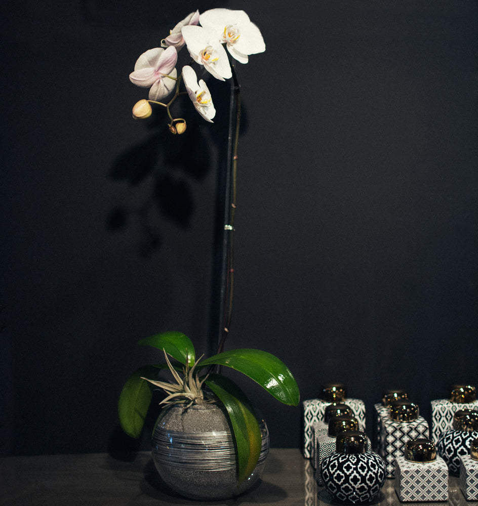 A single phalaenopsis stem rests within a 6" tall circular vase, filled to the brim with layers of metallic silver sand and metallic silver middolino finished with the perfect accent of a tillandsia air plant. Orchid picured stands at 25" tall, with the arrangement standing at approximately 31" tall overall. Please note that orchid stems will vary in height.