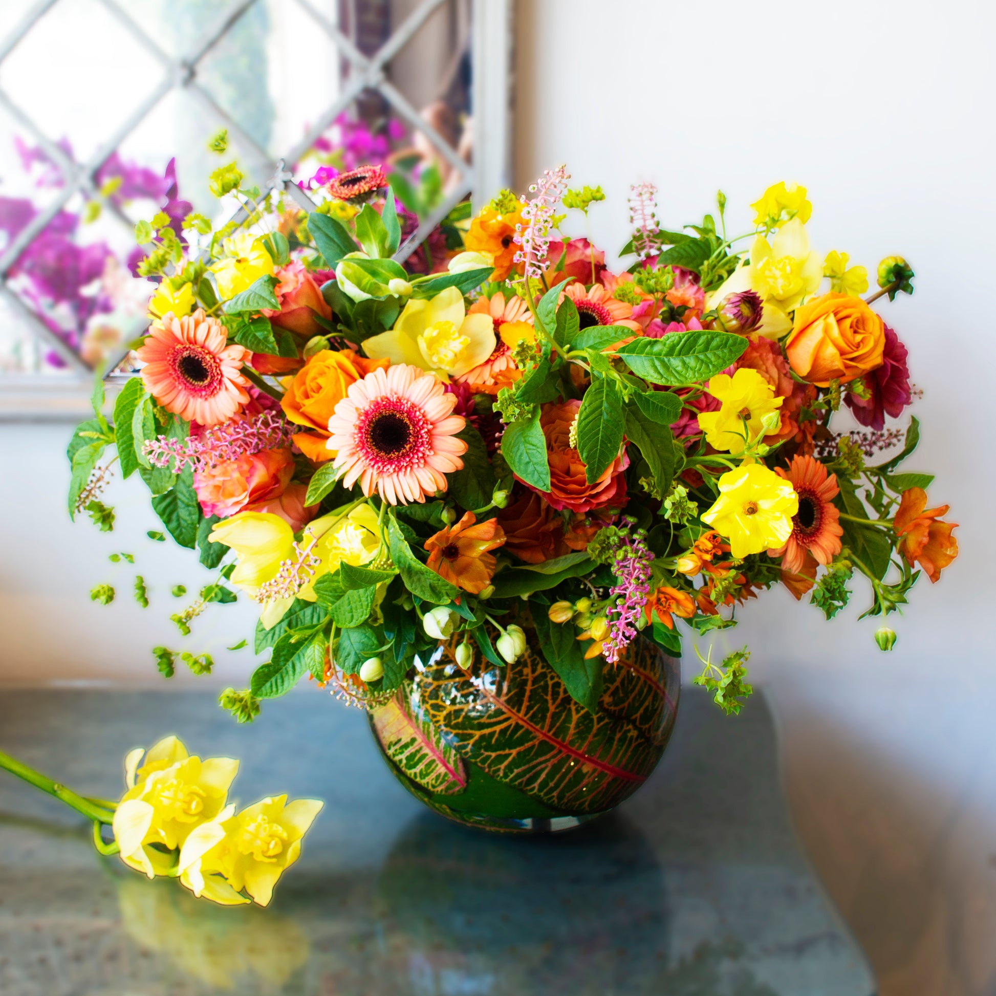 A Festive Delight is a spectacular selection of bright yellows, pinks and oranges balanced by green pokeweeds. This eclectic display of Gerber Daisies, Orange Roses, Free Spirit Roses, Winter Roses, Butterfly Ranunculus, Dahlias and Cymbidium are perfect for those love wild whimsy with a dash of playful radiance. Bursting from a leaf lined glass vase which stands at 8" by 10" the statement piece is overall 19" by 22".