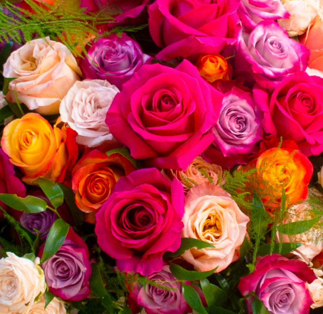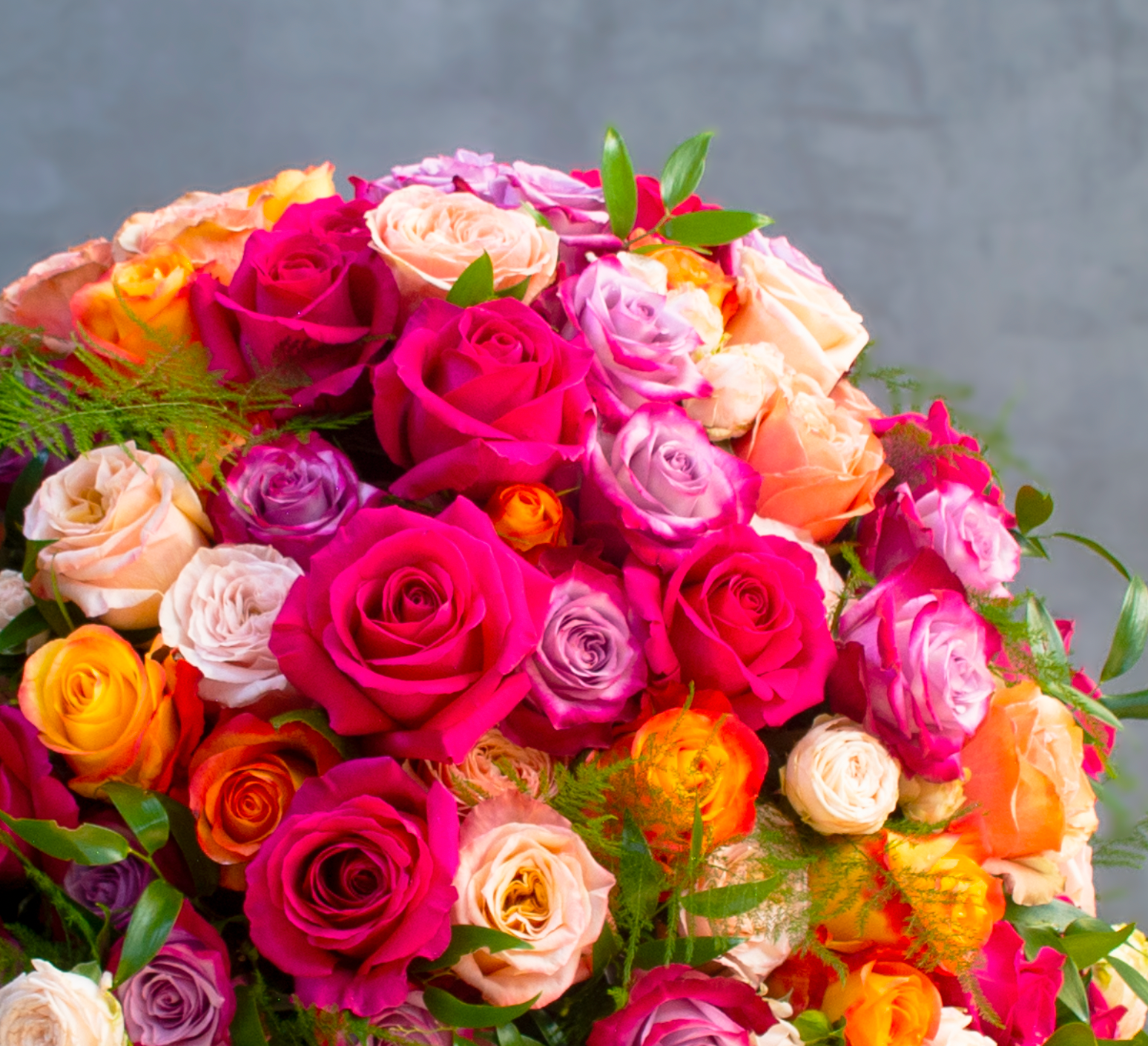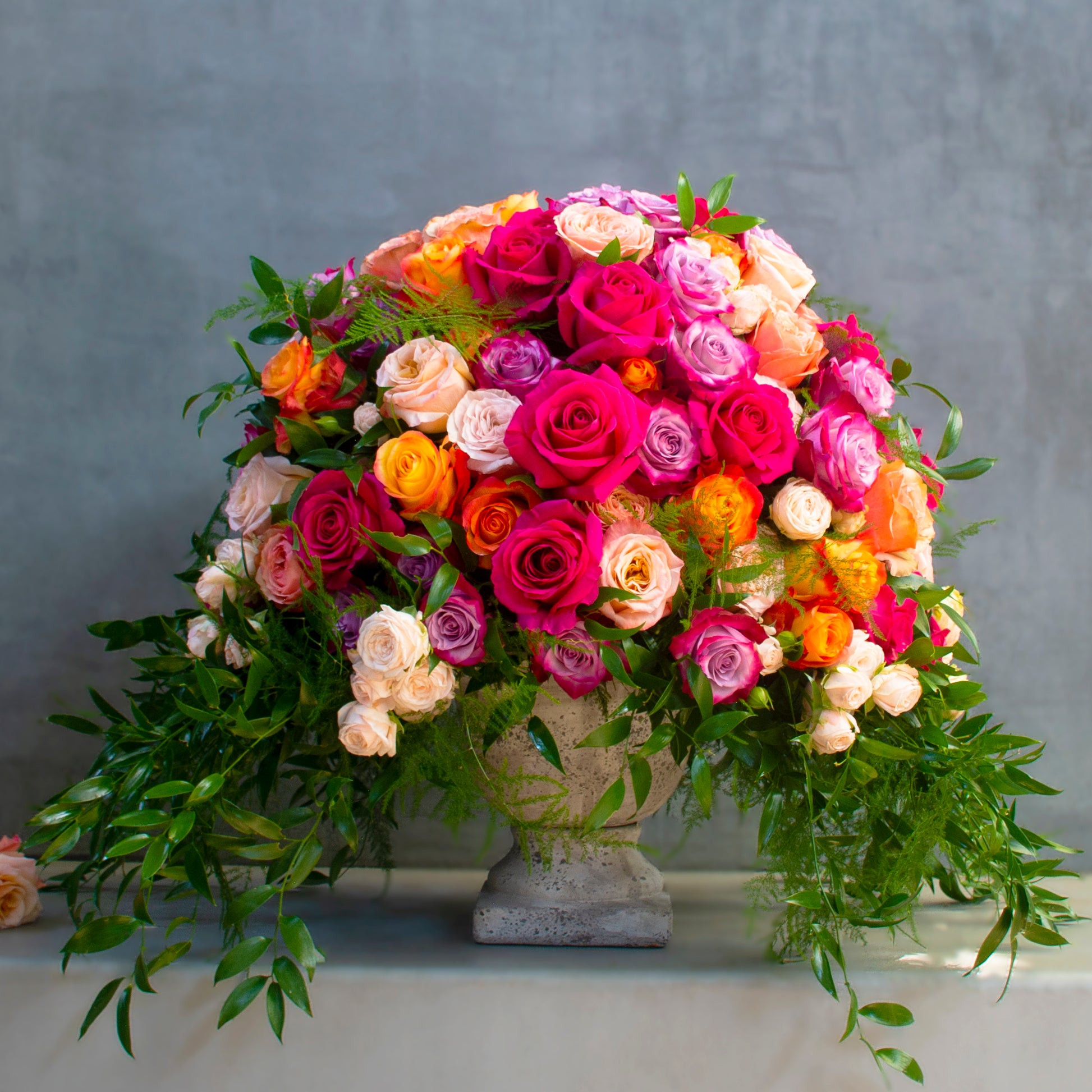 This timeless overflowing arrangement is blooming with 125 roses and greenery cascading down the textured gray vase. These roses range in incredible hues of pink, fuchsia, orange and blush. A Majestic Romance stands at 24" tall with a width of 20".