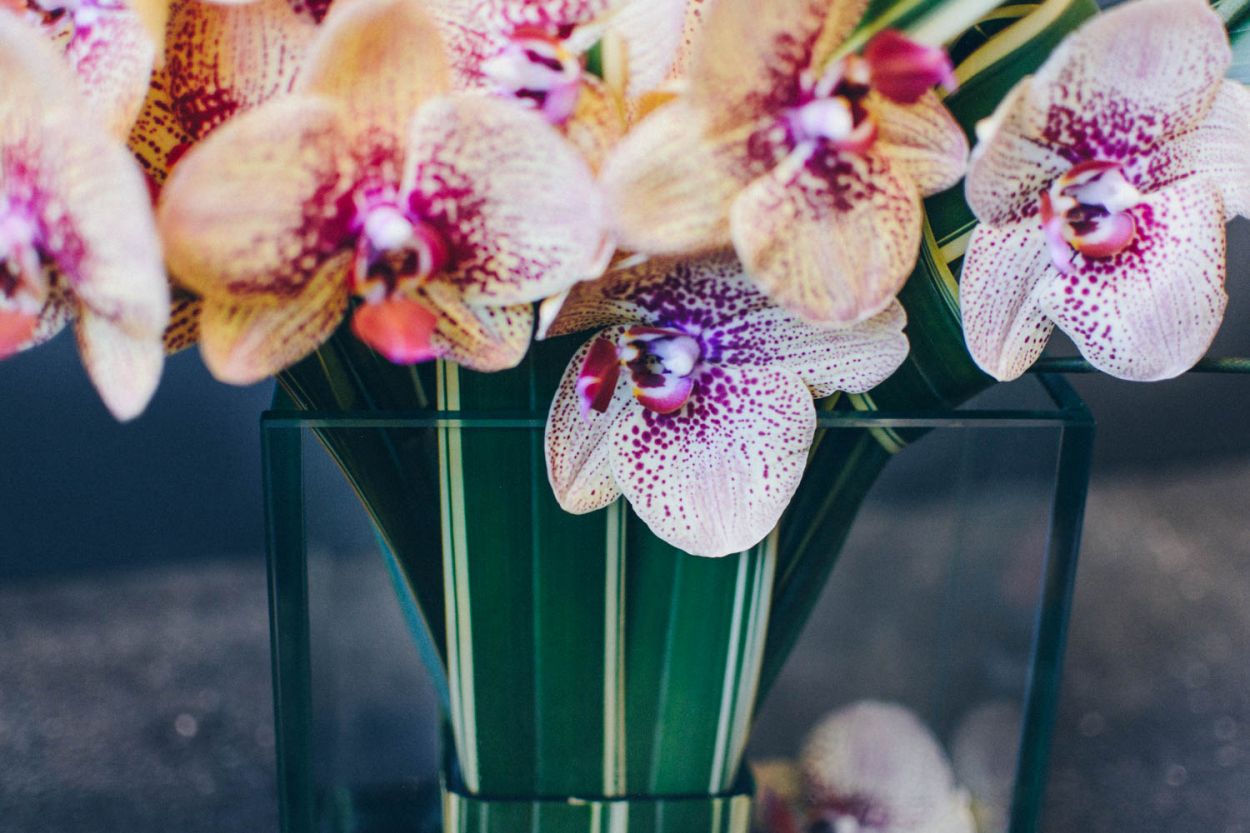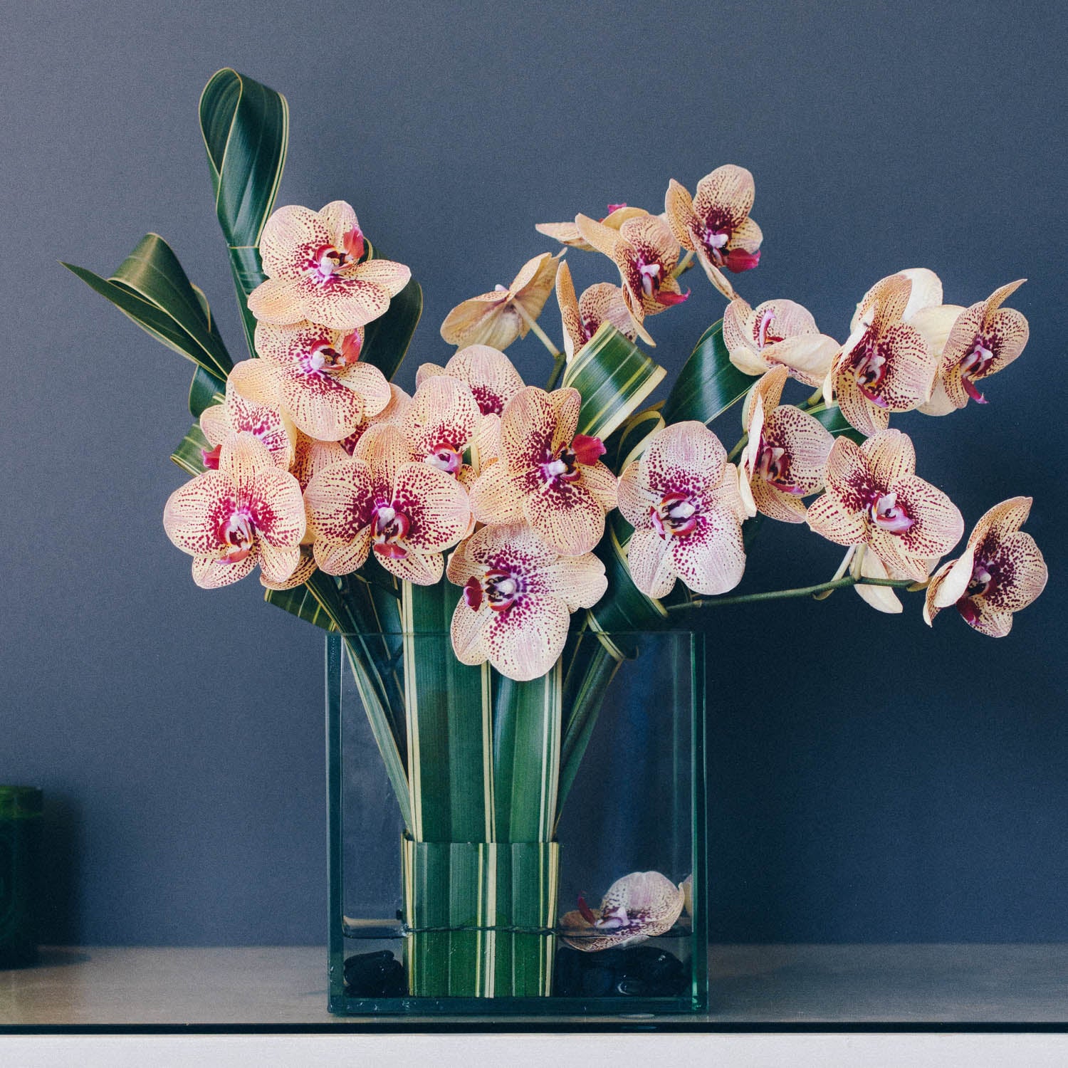 Contemporary and fresh, this stunning new design is sure to take your breath away. Two-toned phalaenopsis stems create a structural masterpiece amongst knotted flax leaves that can be seen submerged within the 11" by 11" glass vase. Overall, this arrangement stands at approximately 18" tall and 20" wide.