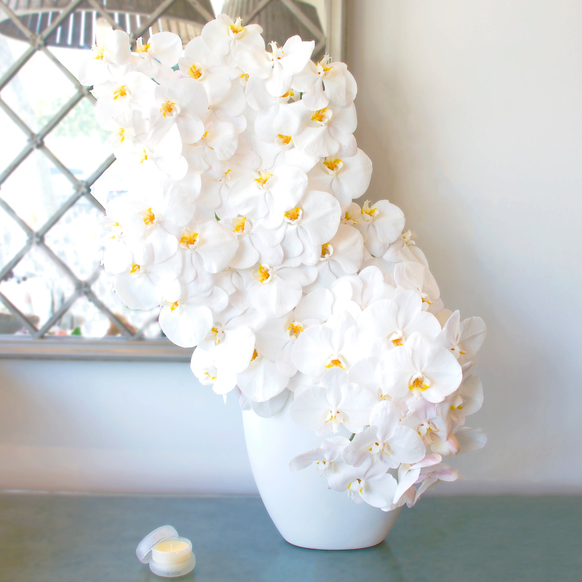 A Waterfall of Orchids is a larger than life asymmetrical arrangement with 12 stems of stunning White Orchids backed by large green leaves. The arrangement is striking in size and shape with delicate details of yellow at the center column of the flower. Erupting from a 12" by 12" modern vase (wide from the front narrow from the side view) this arrangement stands at 33" by 21". This spectacle will wow anyone and create a stunning center piece for any room.