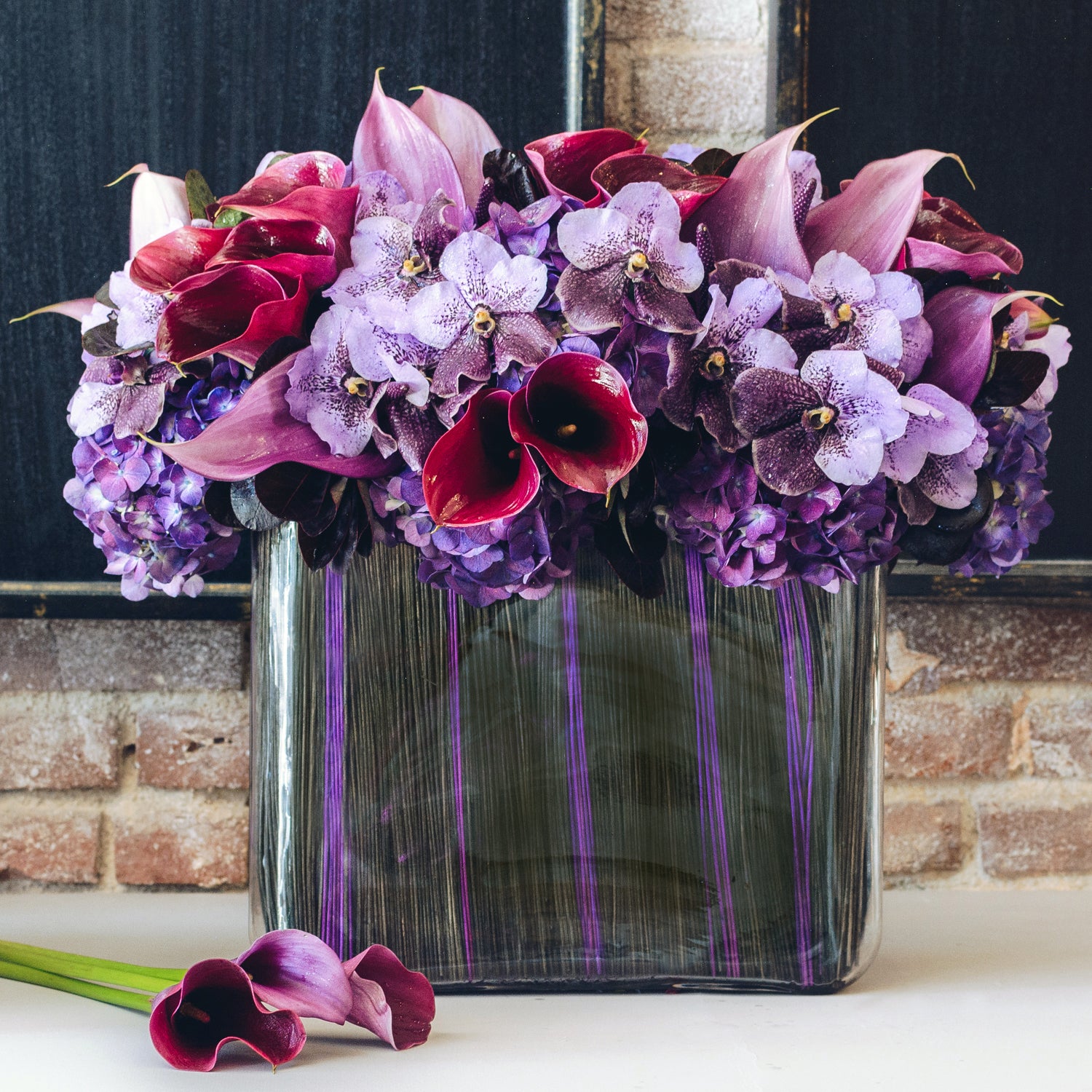 Allow this magical collection of purple florals to bewitch you! Deep burgundy calla lilies, lavender hued anthuriums, and two-toned vanda orchids float, as if on a cloud of amethyst. This arrangement sits atop a 12 inch tall by 16 inch wide glass vase lined with stripes of black and purple midollino. This dazzling new design stands at approximately 20 inches tall, overall.