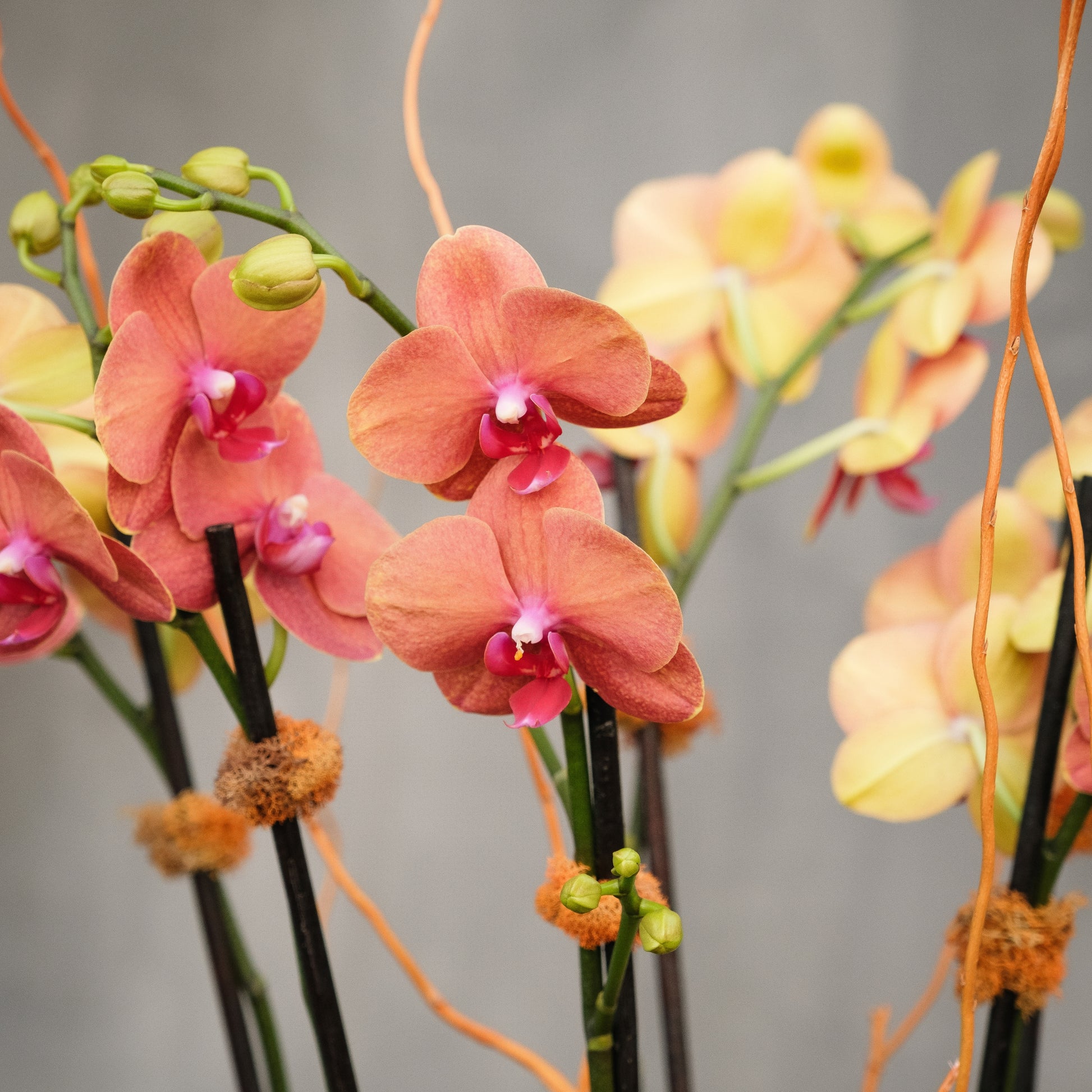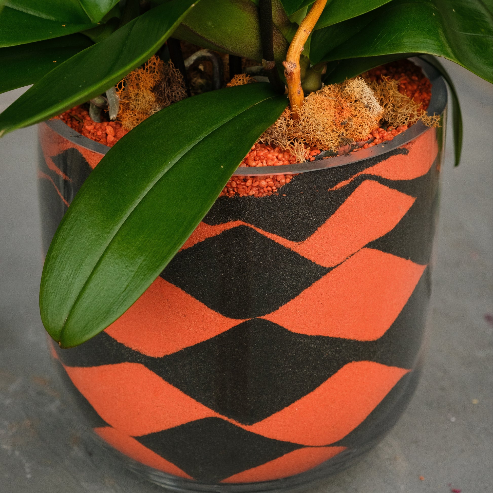 Graceful and contemporary, Autumn Muse Orchid brings a sophisticated seasonal touch to any space. Planted in a hand-painted orange and black harlequin vase, this double-stem Phalaenopsis Orchid showcases blooms in rich tones of apricot, coral, and soft gold, accented with sculptural curly willow branches and natural moss detailing for texture and warmth.