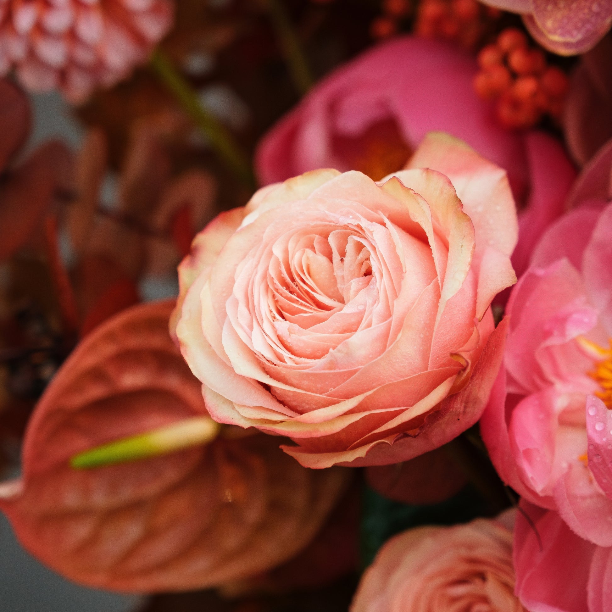 Sculptural, warm, and richly textured, Autumn Rouge celebrates the romance of the season with a refined edge. Designed in a sleek white vessel, this striking arrangement overflows with 5-7 Garden Roses, 5-6 Peonies, 4-6 Cymbidium Orchids, Anthurium, and Fall foliage, accented by clusters of winter berries that bring vibrancy and movement to the design.