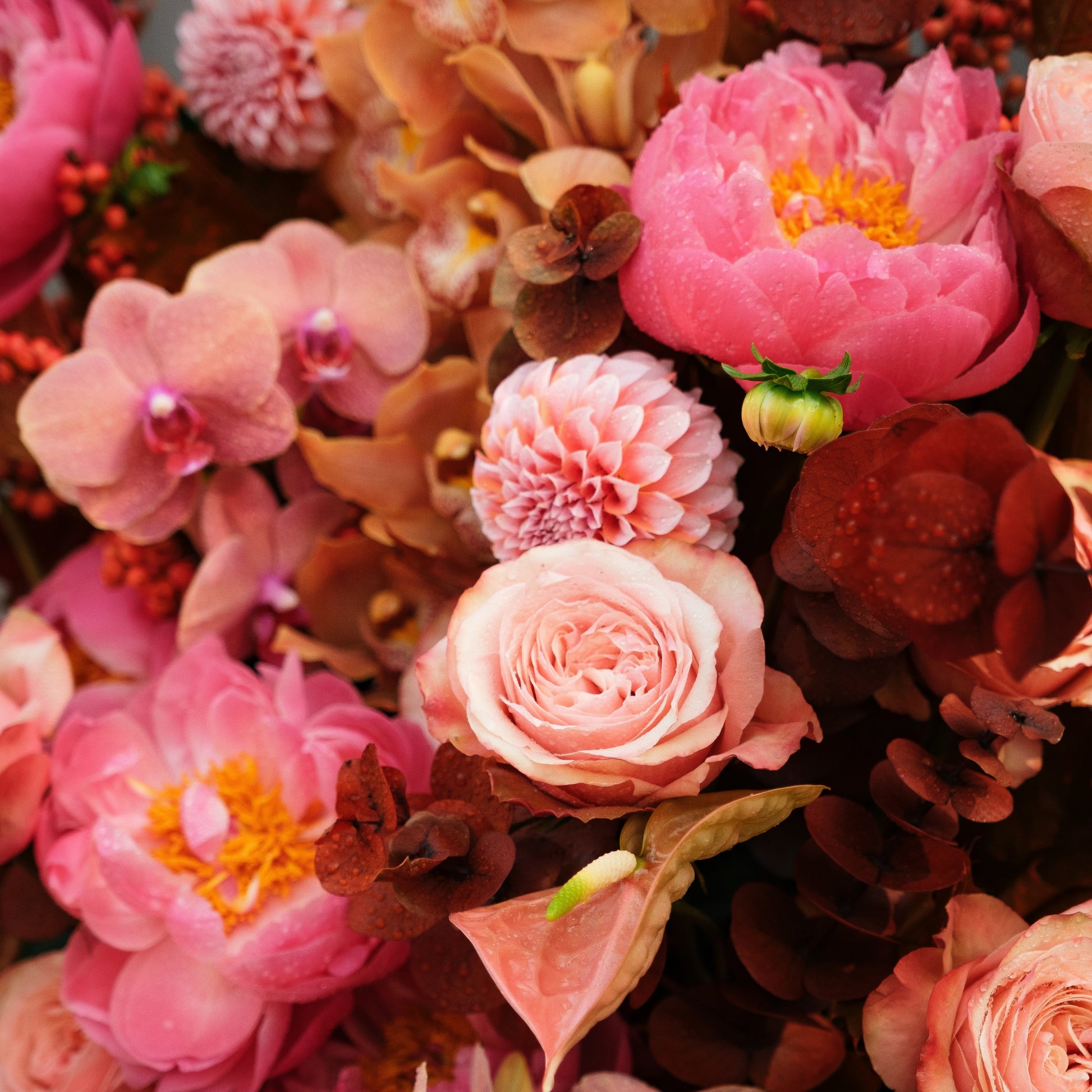Peony, Peonies, Garden Roses, Fall foliage, Cymbidium Orchids