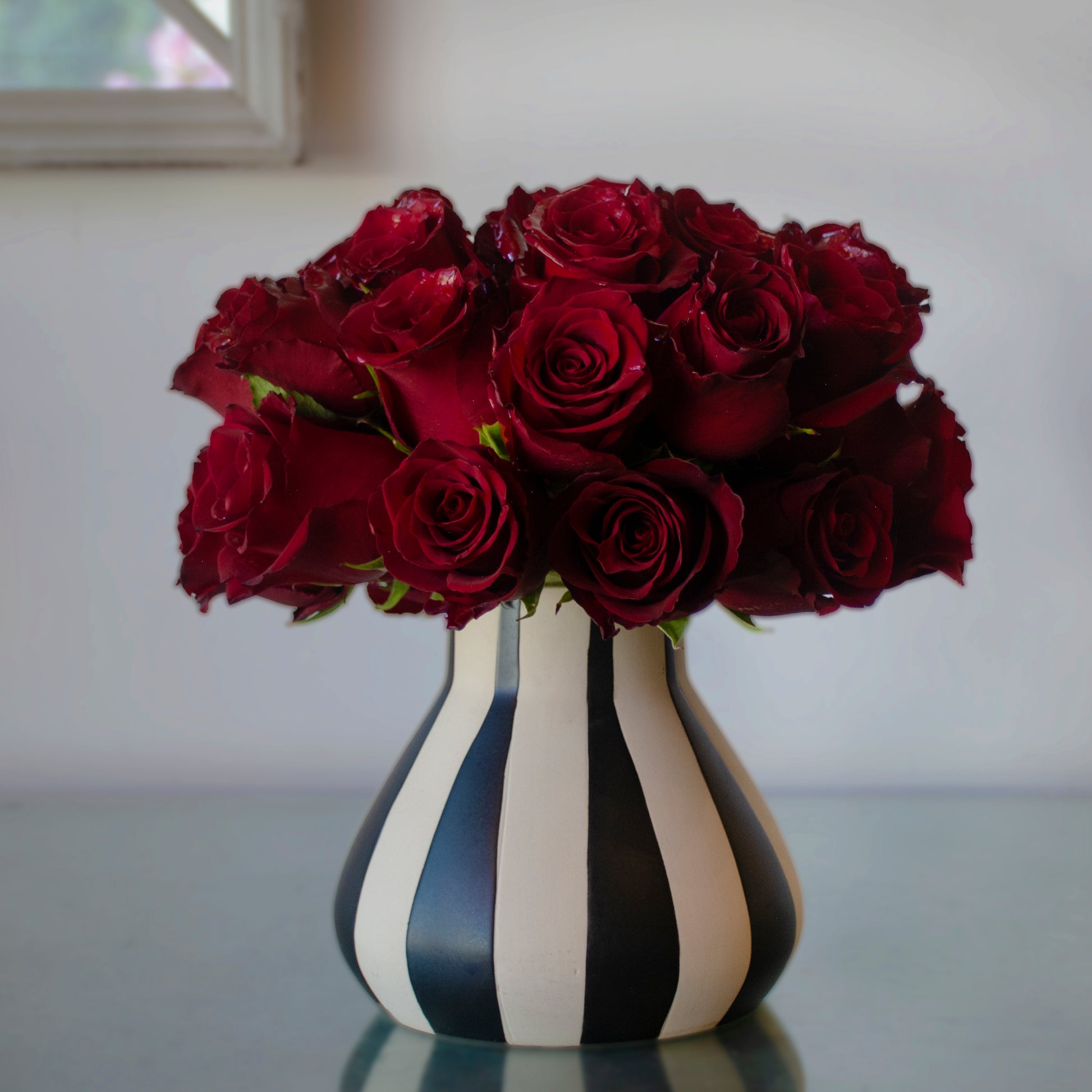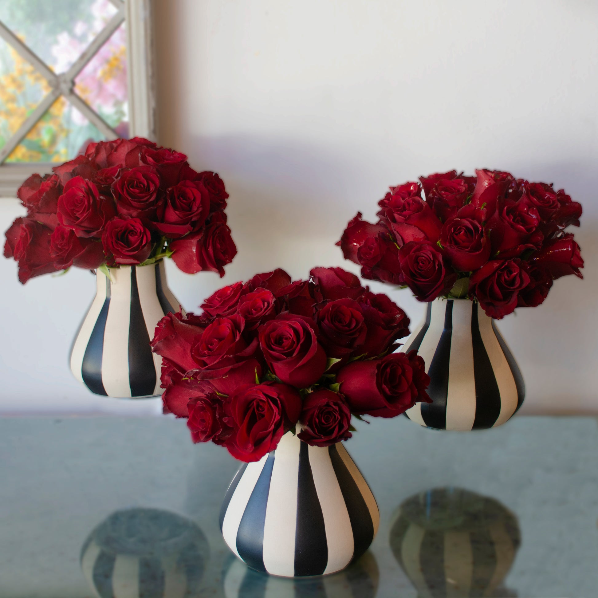 Step into the world of dark romance and ghostly glamour with our Beetlejuice Beetlejuice collection. 25 blood red Explorer roses are nestled in a black-and-white ceramic vase, eerily elegant clouds of crimson atop ghoulishly striped vessels. Available as a spooky set of three or a haunting single, these blooms deliver a touch of macabre luxury all season long. Standing at 9" tall, with blooms spanning 10" wide, these arrangements are a must have this spooky season.