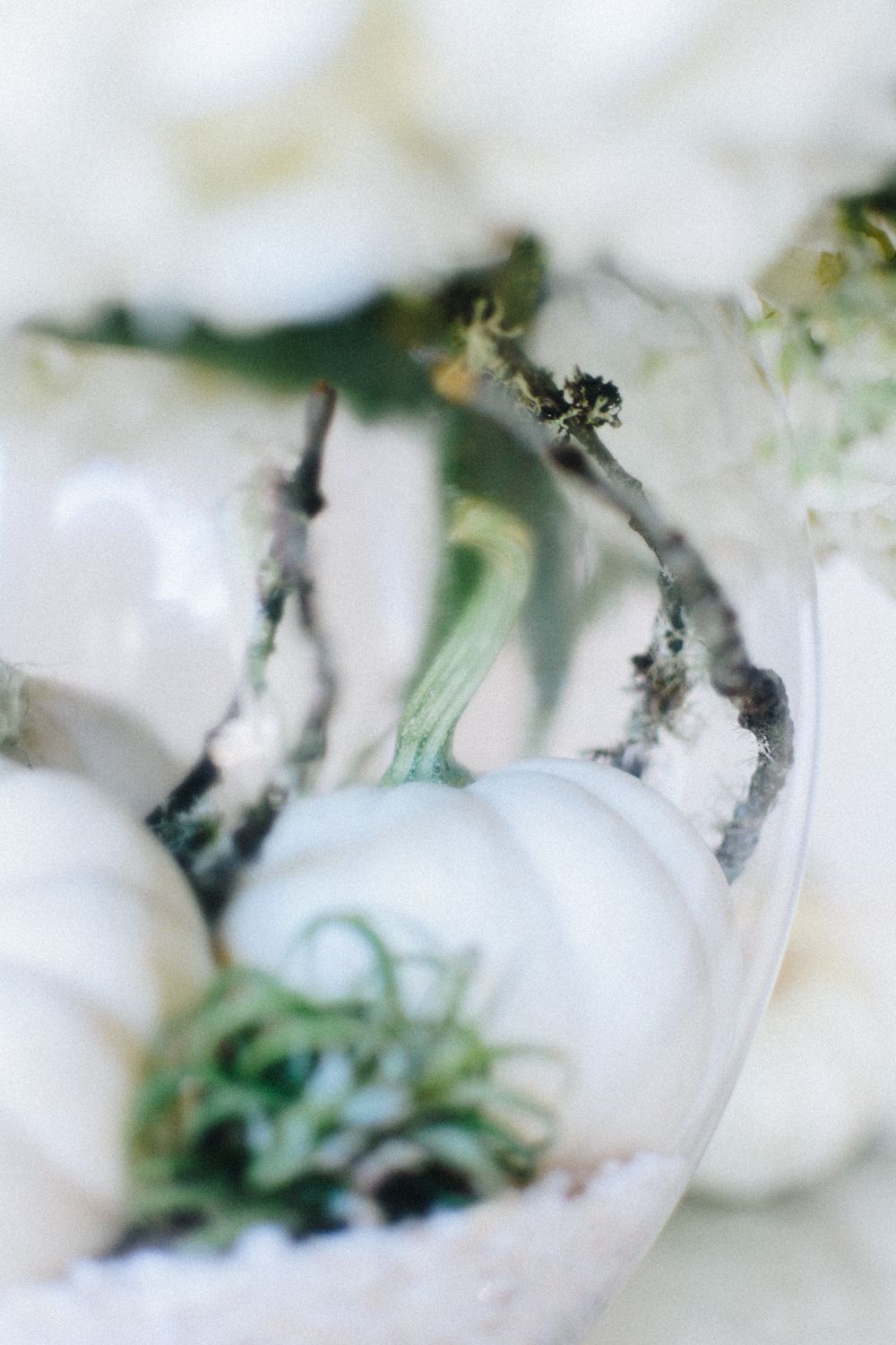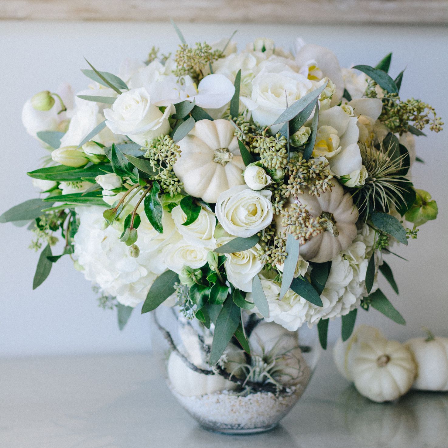 Inside the 8" tall glass vase, you'll discover a captivating scene featuring additional white miniature pumpkins, air plants, and gracefully twining branches. This remarkable arrangement stands at approximately 18" in height, making it a striking centerpiece for any occasion.