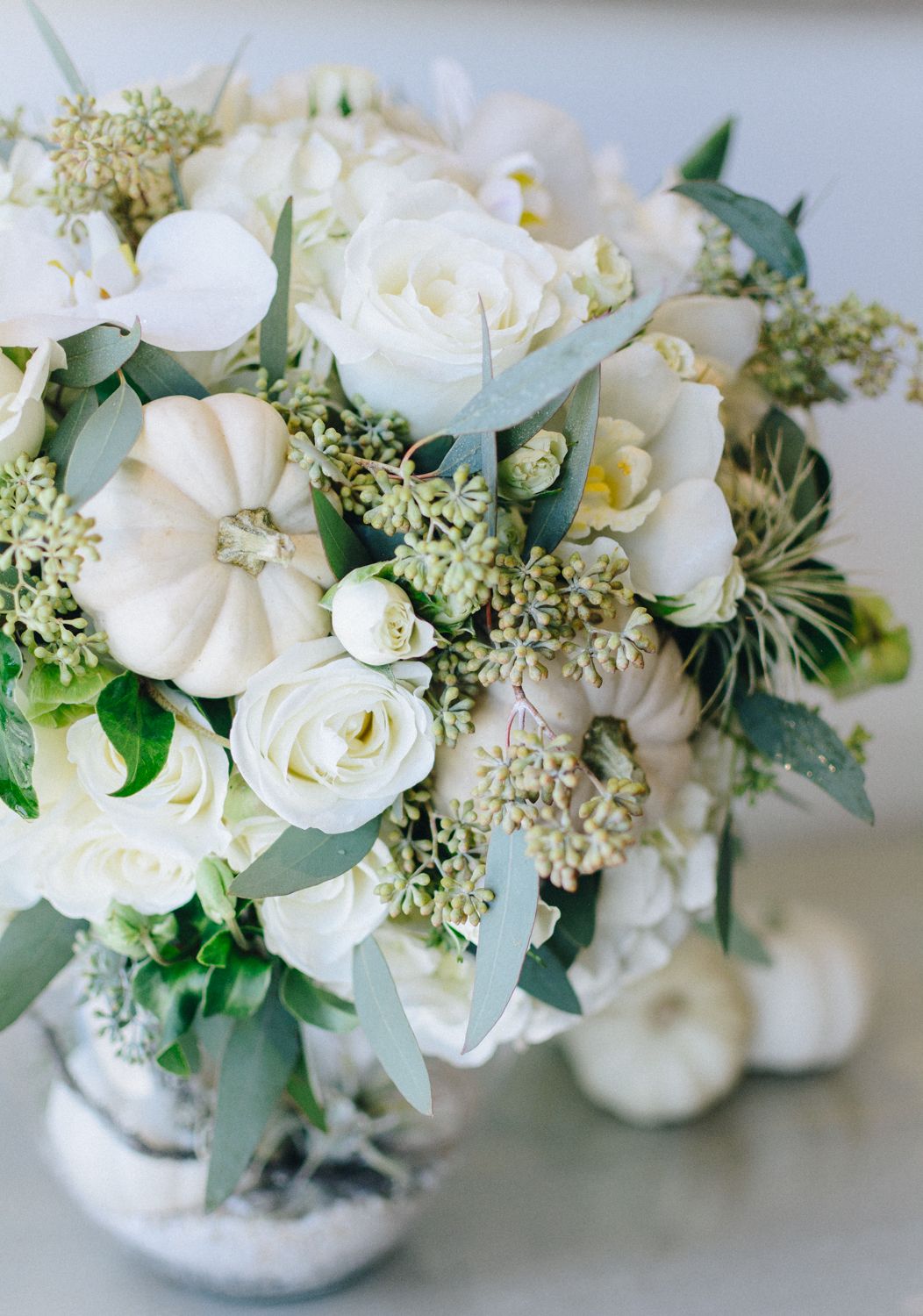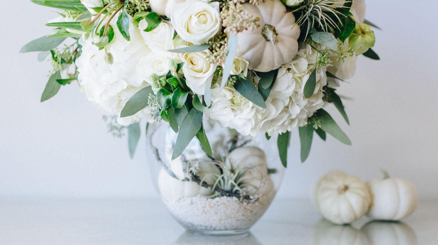 Experience the enchantment of our captivating two-piece floral arrangement! Immerse yourself in the beauty of pristine white roses, delicate tillandsia air plants, elegant white hydrangea, and exquisite white phalaenopsis orchids, which come together to form a lush and dreamy cloud of floral artistry. To add a subtle touch of festivity, we've included white pumpkins that perfectly complement the arrangement.