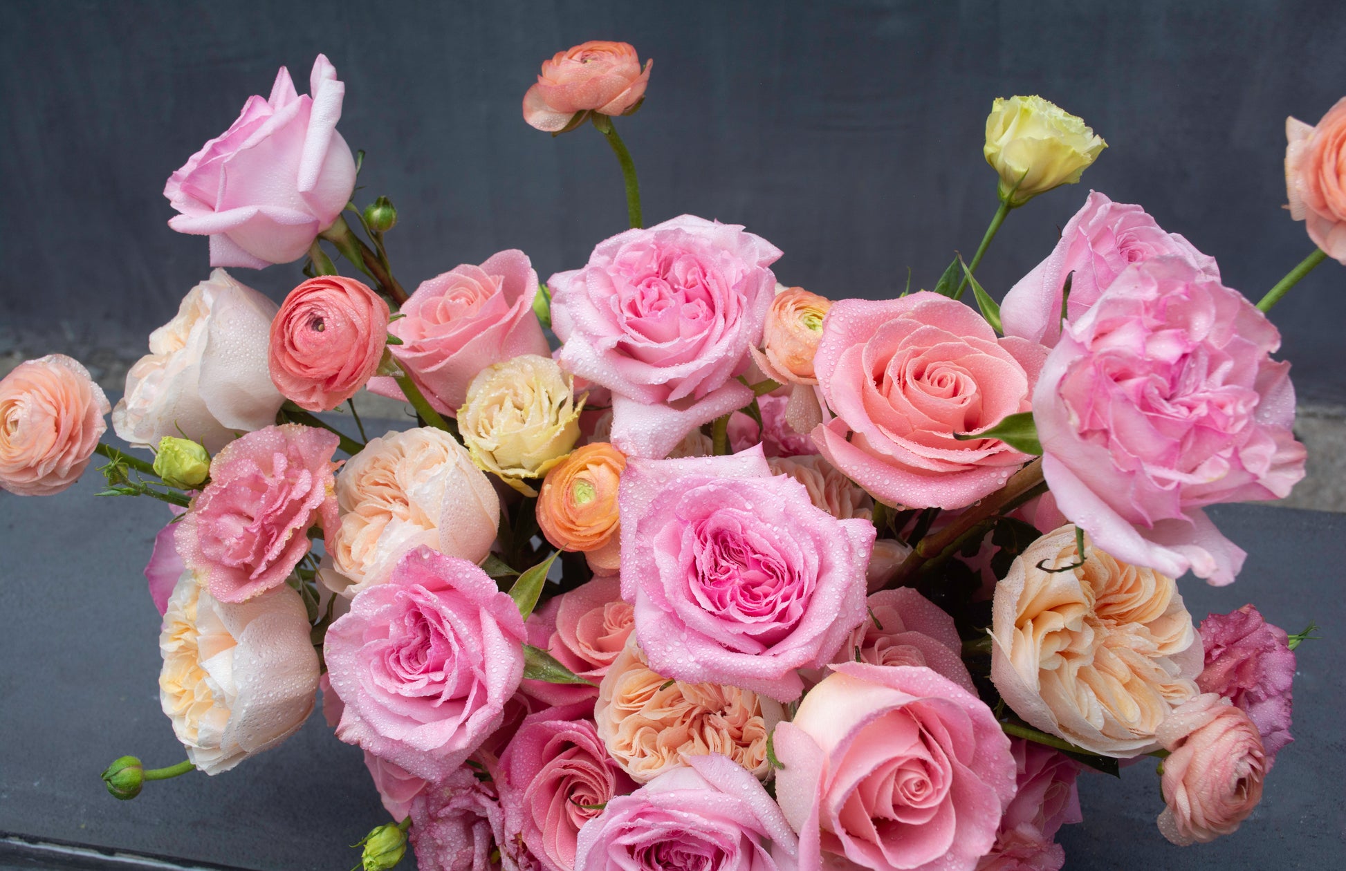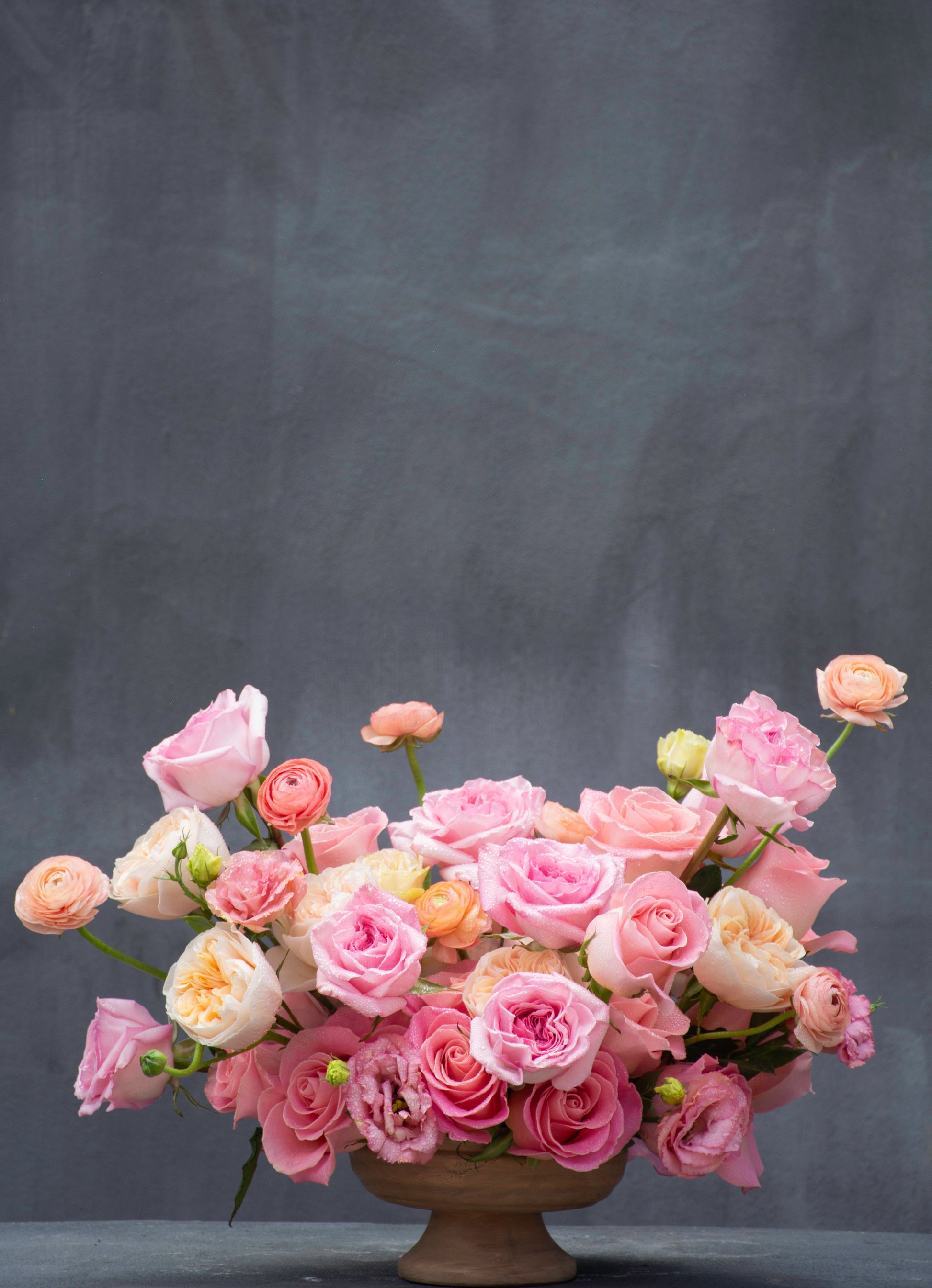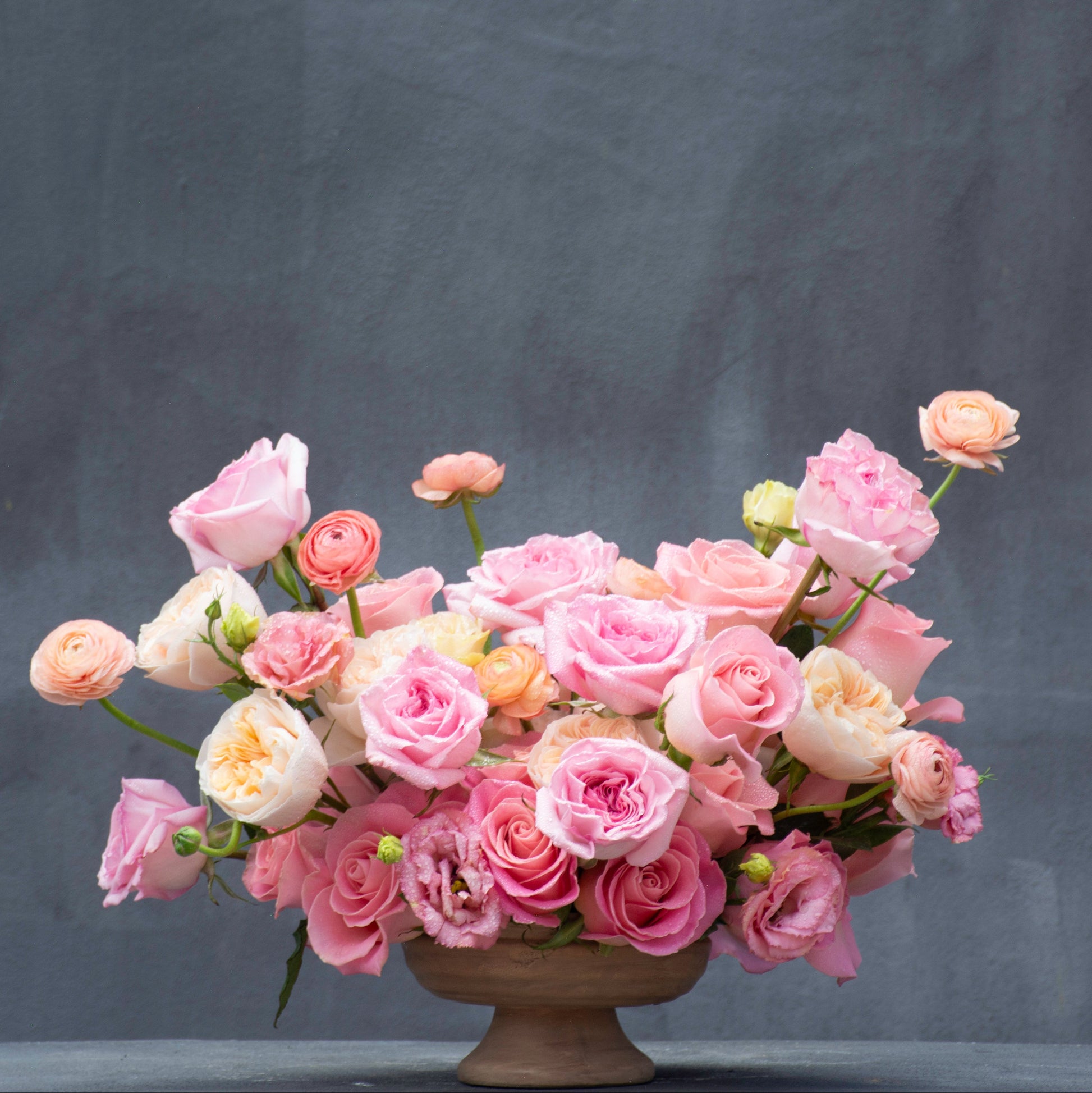 Blush Charm is a tender symphony in soft pastels, where pink Roses and peach Ranunculus dance alongside buttery O'Hara Garden Roses. Nestled in a weathered stone pedestal, this dreamy collection captures the gentle magic of dawn's first light—romance whispered in petals, elegance found in every soft, unfurling layer.