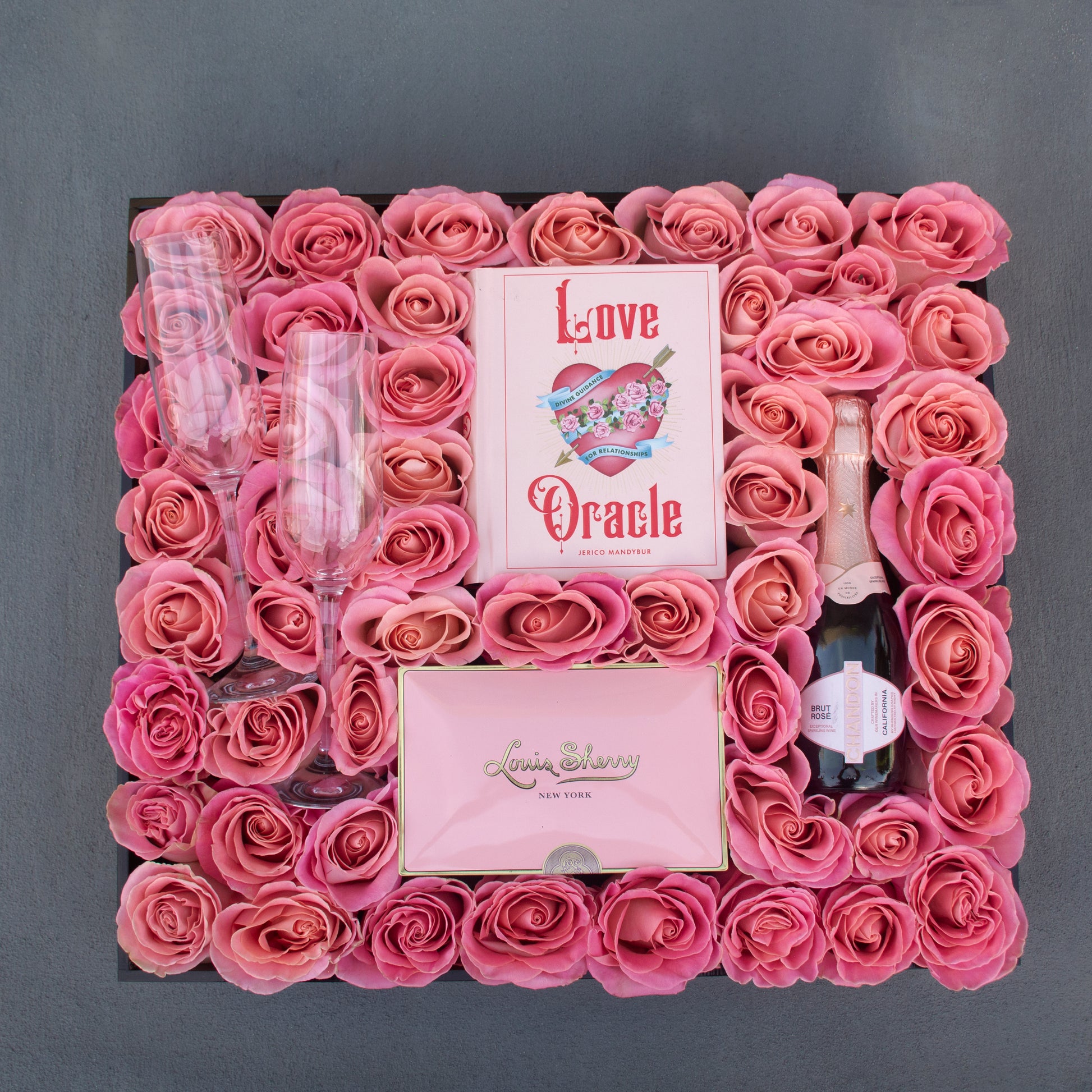 Nestled among the blooms, a bottle of champagne awaits, paired with two delicate glass flutes—a toast to love, laughter, and forever. Sweeten the moment with a 12-piece Louis Sherry chocolate box, each bite a decadent delight. And for an extra touch of romance, the Love Oracle book offers whispers of destiny, guiding you to the magic of your connection.