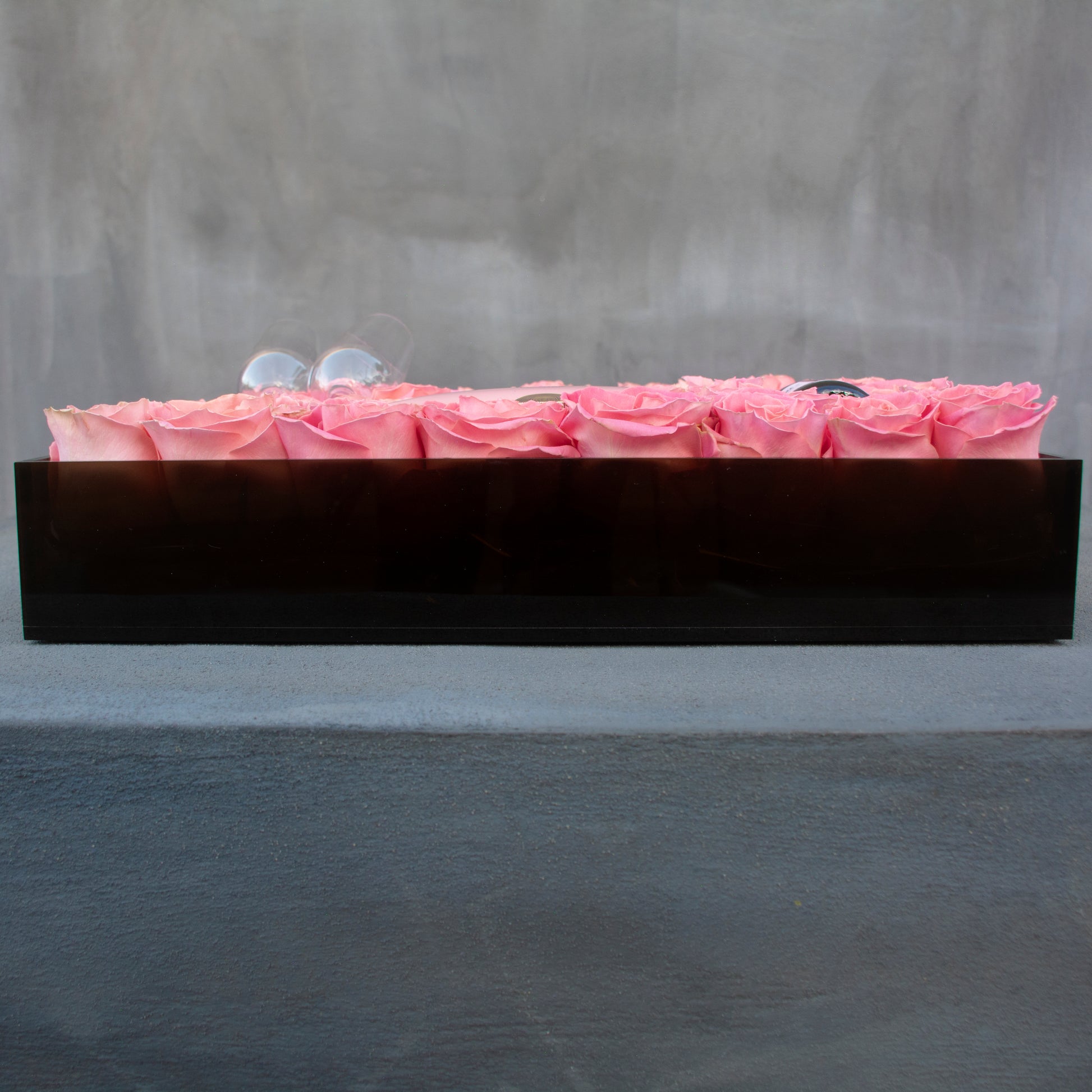 Indulge in a love story told in petals and passion. Blush Crush is a breathtaking floral gift box designed to make hearts race—a stunning brown opaque plexiglass tray (18” W x 16” H) overflowing with more than 50 exquisite Hermosa pink roses.