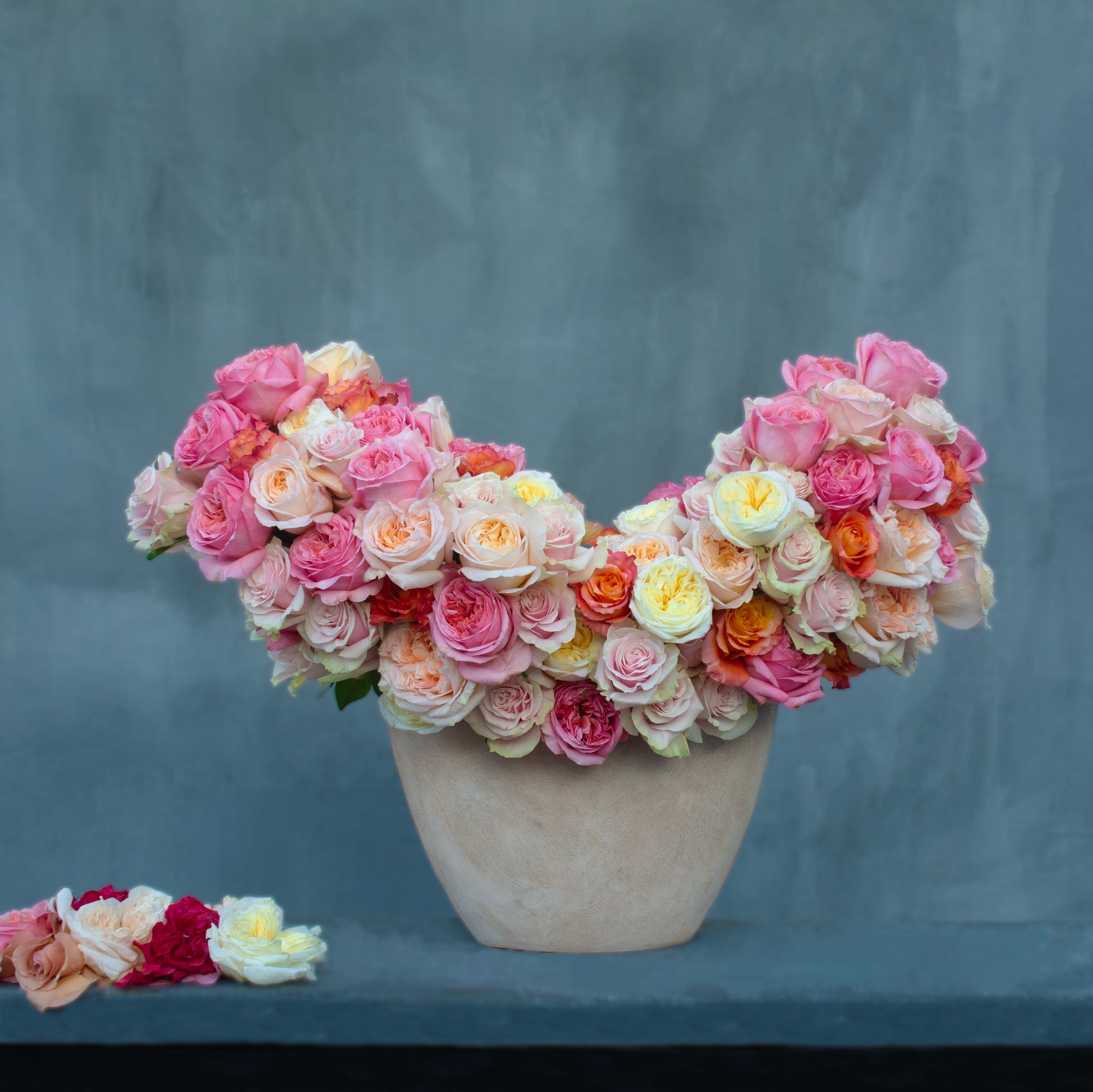 A sculptural composition designed to feel like a love letter in full bloom. This arrangement brings together lush Garden Roses, romantic Juliet Roses, ruffled Pink O’Hara Roses, and delicate Free spirit Roses in a harmonious palette of ballet pink, warm peach, soft buttercream, coral sunset, and creamy ivory. Each rose is intentionally placed to create that sweeping, winged silhouette; full, airy, and fully expressive. The movement feels effortless, while the density of premium garden blooms gives it that couture-level abundance. Anchoring the florals is a matte, sand-toned ceramic vase with a softly curved silhouette. Its organic texture and neutral warmth ground the romance above, allowing the layered pinks and peaches to truly glow against its understated finish.