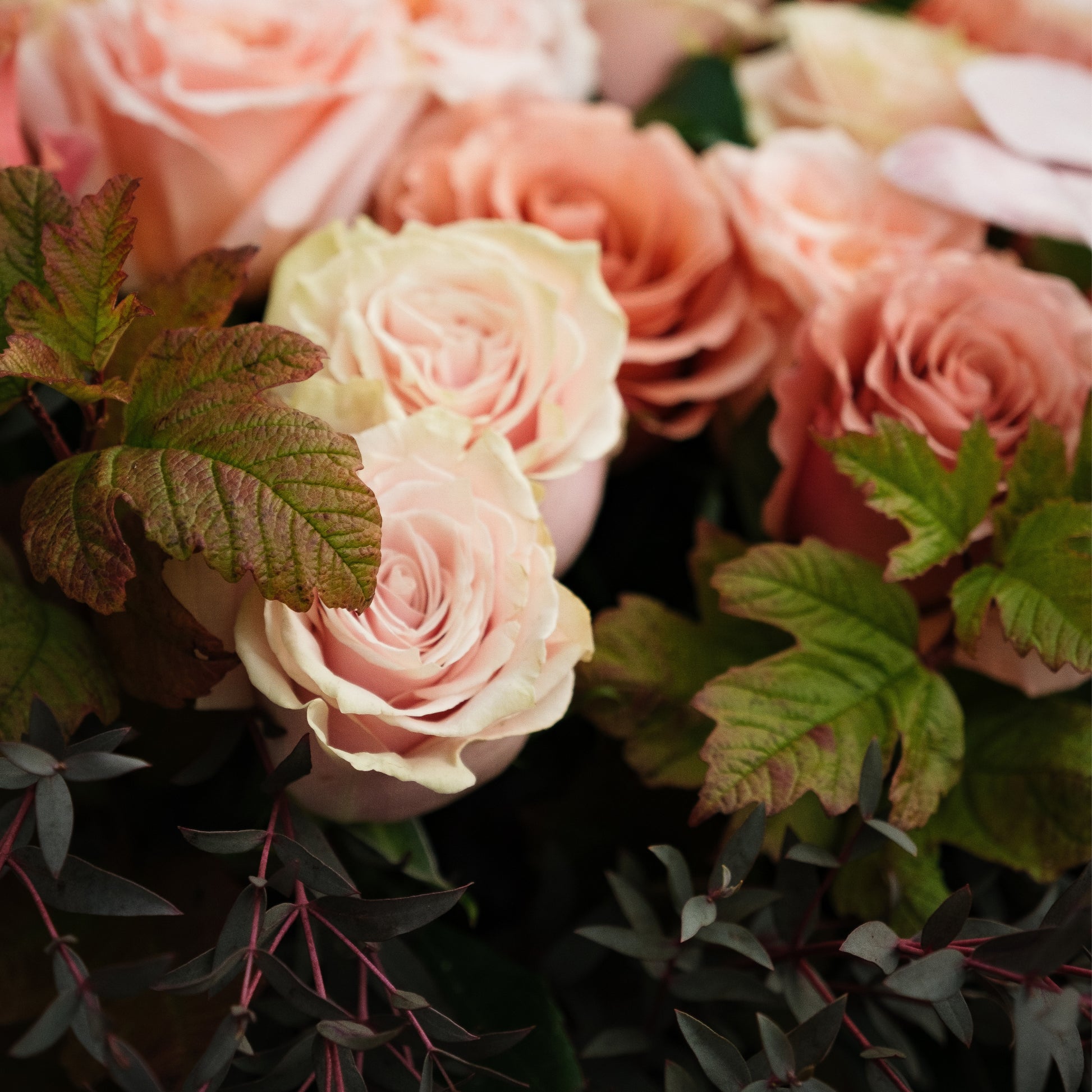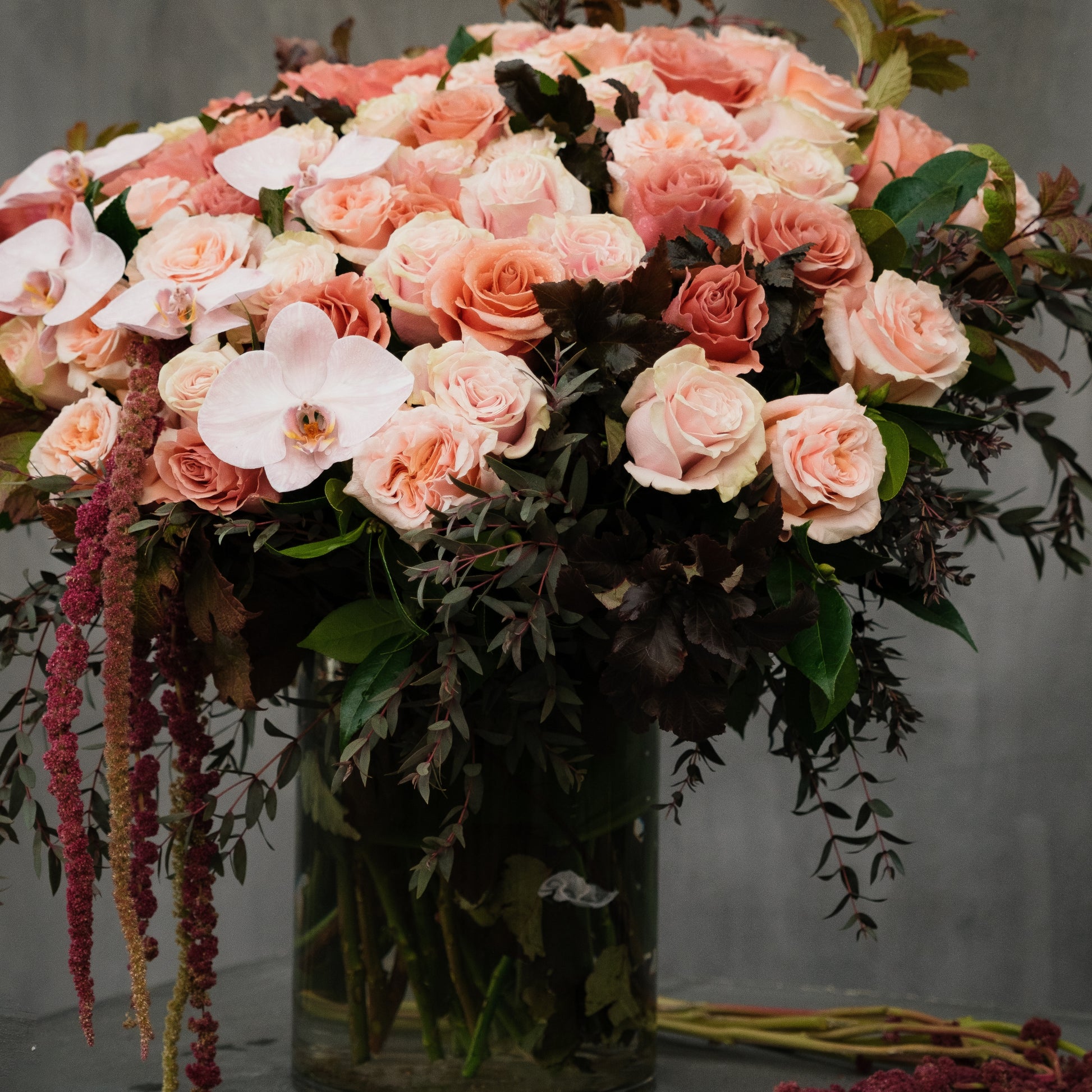 Soft, radiant, and timelessly elegant, Blushing Opal captures the serene beauty of refined romance. This lush arrangement features an abundant array of Garden Roses, Blush Spray Roses, and Phalaenopsis Orchids, accented with cascading Amaranthus and rich seasonal foliage in deep wine and green tones.