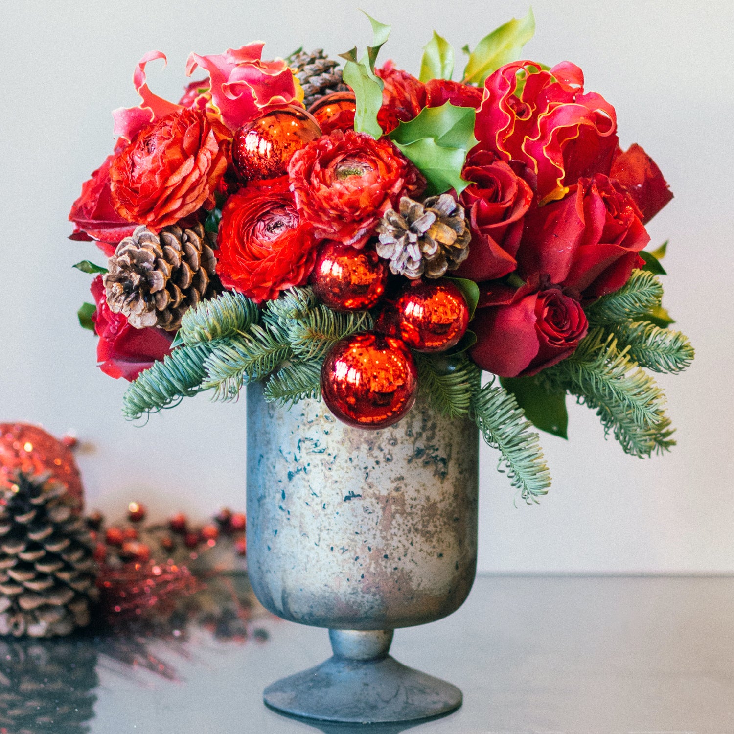 Be merry and bright with this merry medley of bright red ranunculus, red roses, and gloriosa lilies. Christmas greens, decorative ornaments, and miniature pinecones pull the festive look together atop a 5" antiqued pedestal vase. This seasonal design stands at approximately 8" tall overall.
