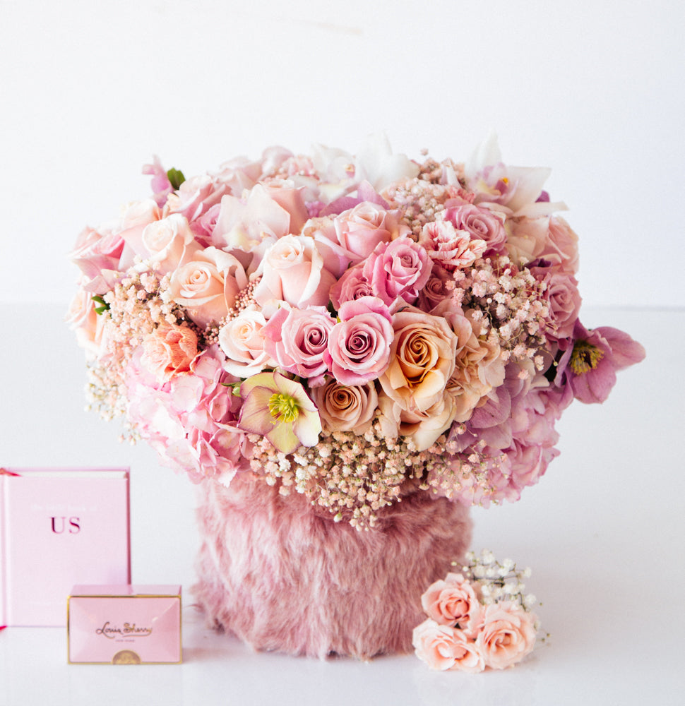 Blush roses and cymbidium blooms are complimented by the baby’s breath and hydrangea placed throughout. Lisianthus and winter roses are placed throughout, with rice flowers adding the final touch. Resting inside an 7” tall pink fur-lined vase, overall this arrangement stands around 15” tall.