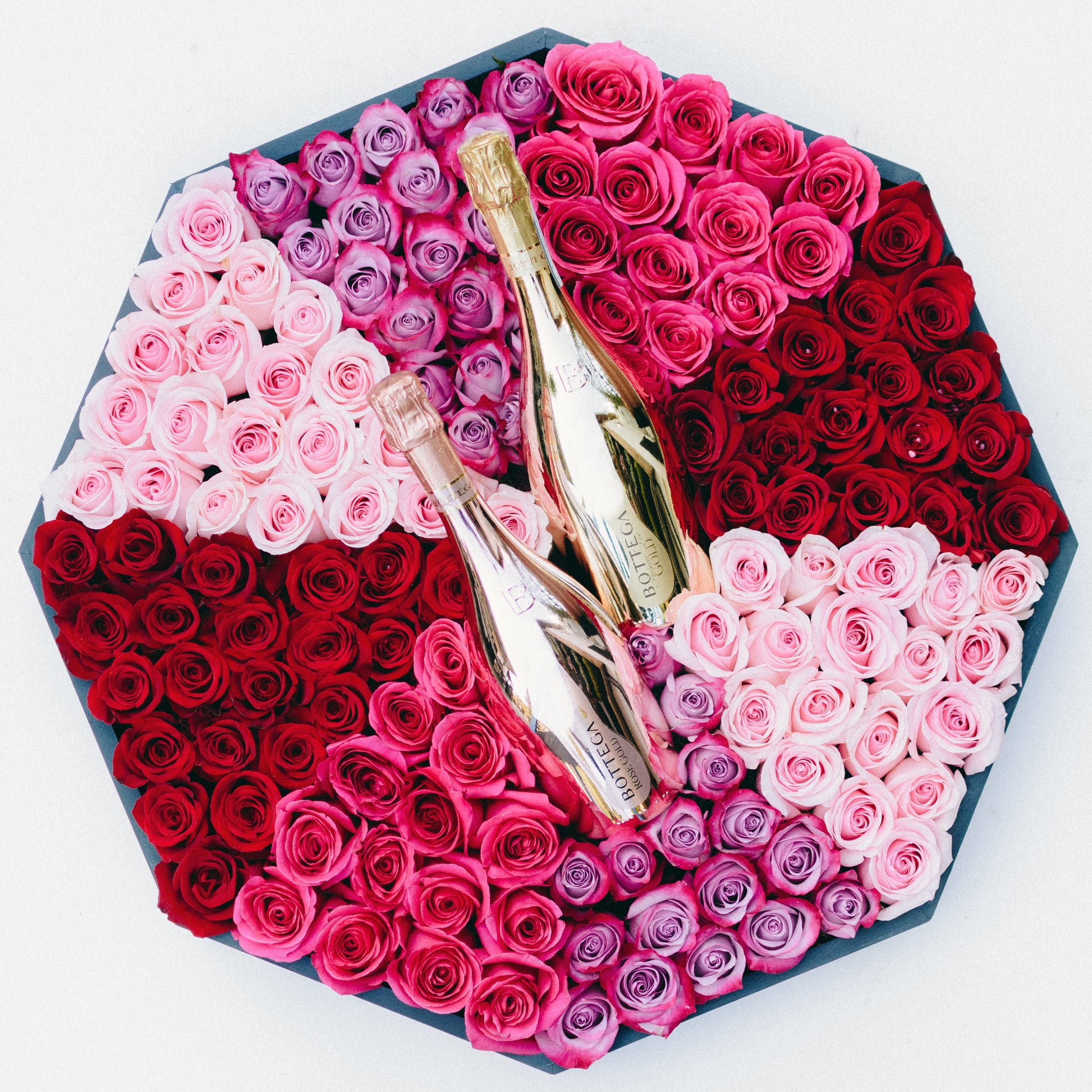 Make a statement with this breathtaking private Rose garden complete with celebratory bubbles. Up to 150 Roses in shades of pink, red, blush and lavender accompany two bottles of Champagne in a 24" wide hand-painted grey wooden octagonal box.