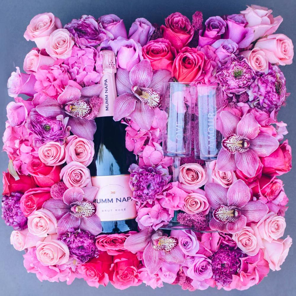 Cheers to love, laughter, and happily ever after! This lush floral box overflows with an assortment of the finest blush, lilac, and hot pink roses accompanied by pink hydrangea, purple ranunculus in full bloom, and violet cymbidium orchids. A bottle of champagne or sparking wine rests gently in the middle alongside two of the most romantic champagne flutes you will ever come across. This sumptuous arrangement spills over a 16" by 16" hand stained wooden box and measures approximately 18" by 18" overall. **Please call for custom orders and/or to upgrade bottle**