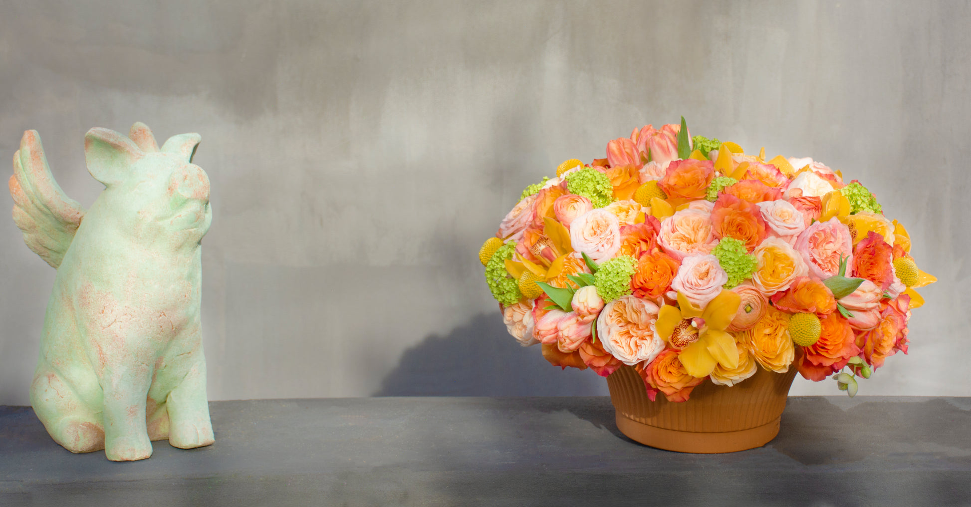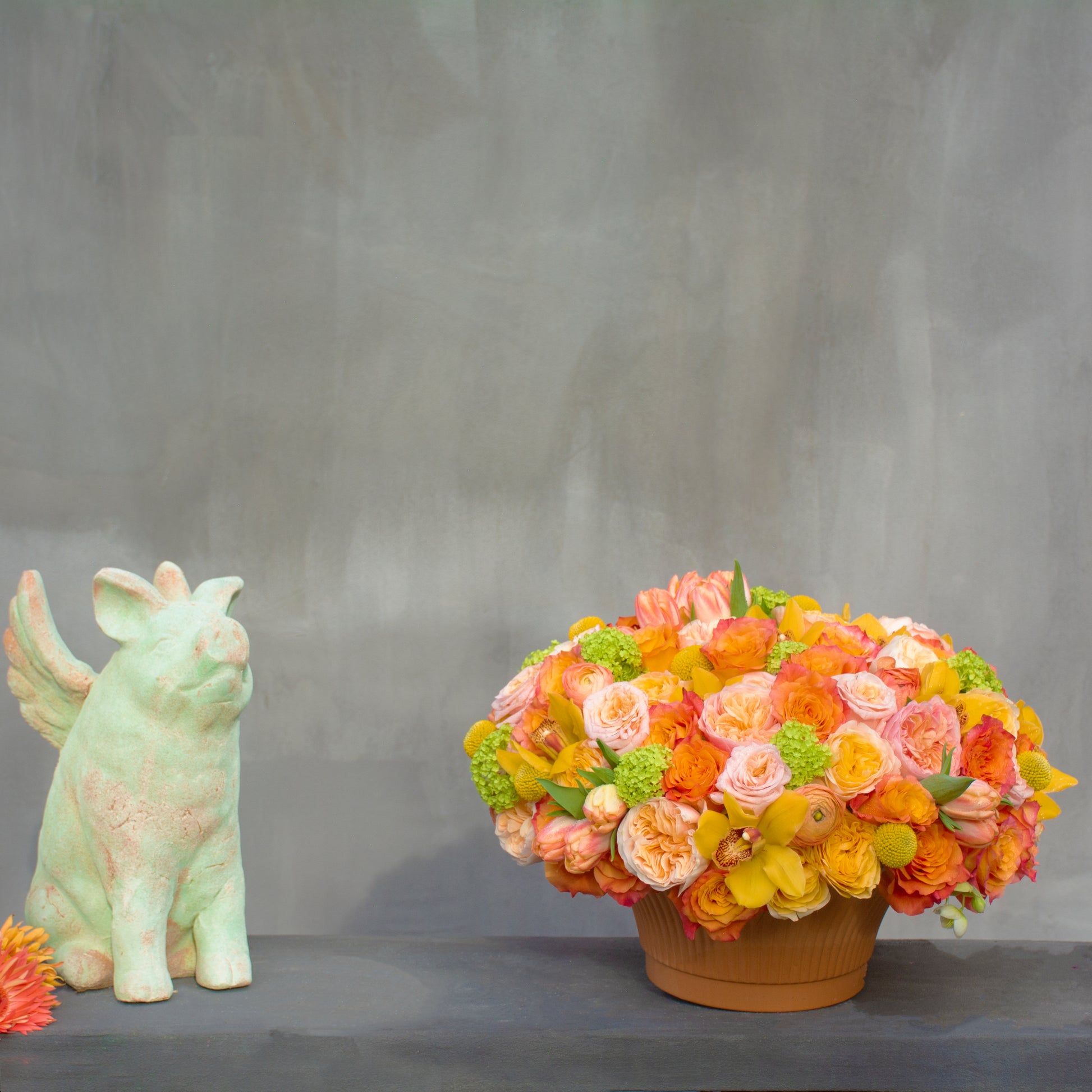 A radiant burst of citrus-kissed hues, Clementine is a symphony of golden yellows, fiery oranges, and soft peaches. Free spirit roses and turtle roses dance alongside two-toned tulips, their ruffled petals blushing with warmth. Bright billy balls and fresh viburnum lend a touch of whimsy, while yellow cymbidium orchids add a luxe, exotic flair. Nestled in an elegant terra cotta vessel, this lush arrangement captures the essence of sunlit afternoons and effortless elegance.