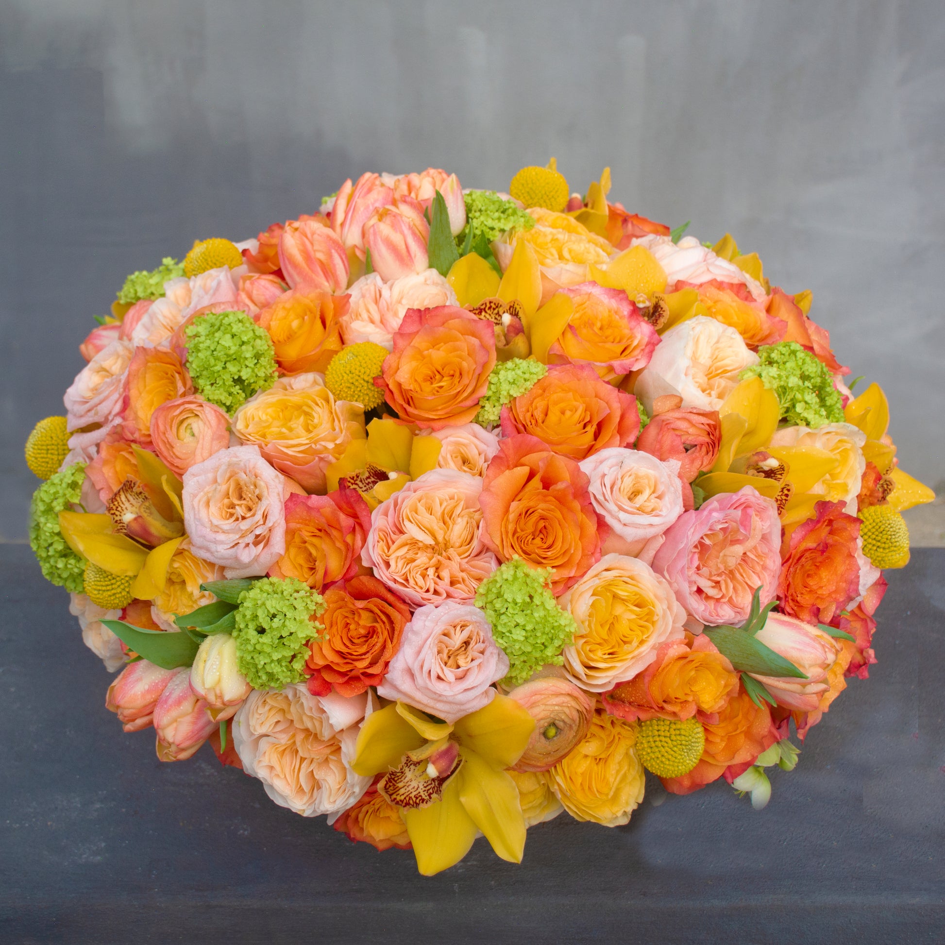 Yellow Cymbidium Orchid, Free Spirit Rose, Turtle Rose, Billy Ball, Viburnum, Tip Top Rose, Tulip