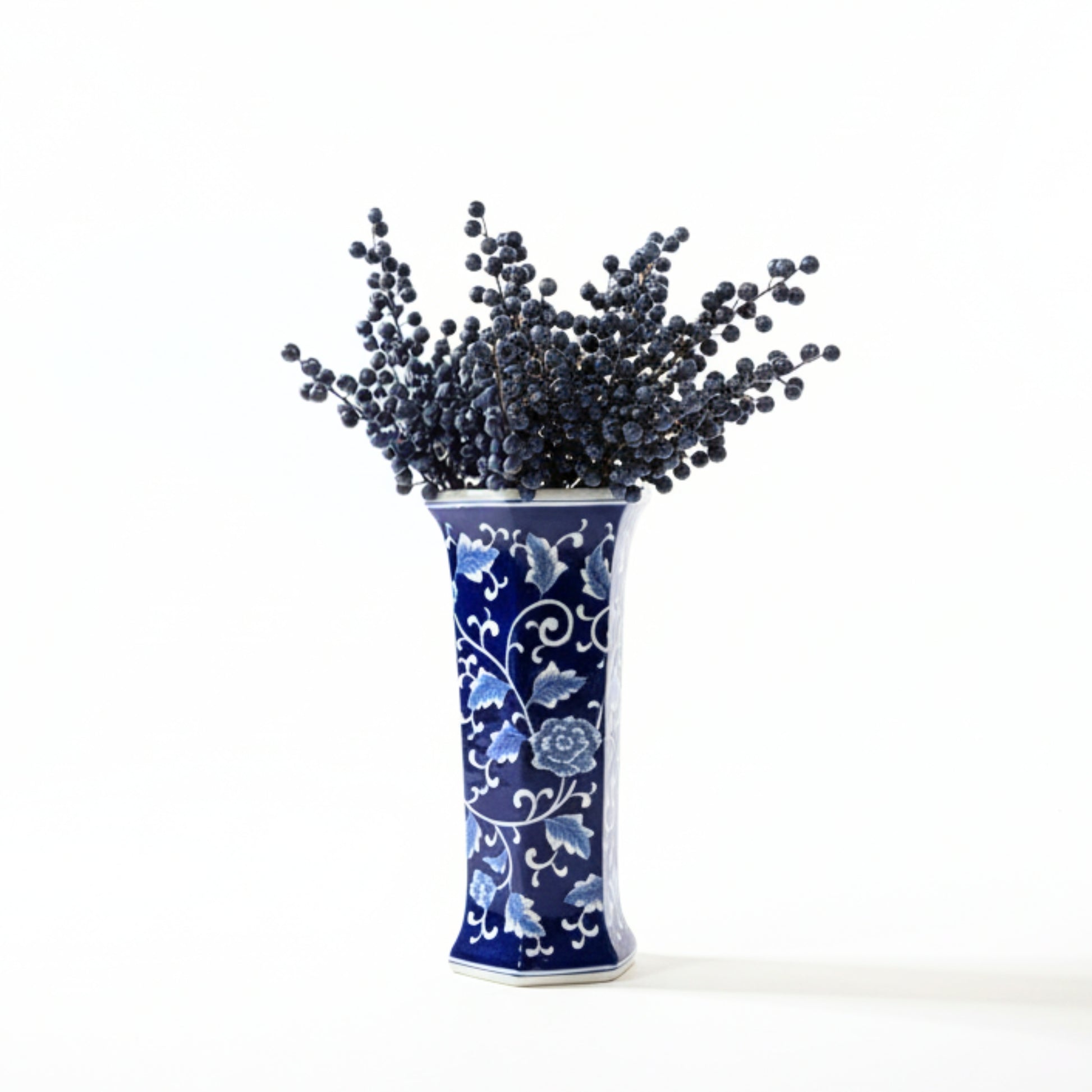 Timeless and refined, the Midnight Porcelain Column is a study in classic form and rich color. Crafted from glossy porcelain, this sculptural vase features an elongated silhouette adorned with intricate floral and vine motifs in layered shades of deep indigo and soft blue. The contrast between the crisp white detailing and the saturated blue ground evokes traditional European and Asian porcelain influences while feeling effortlessly elevated and modern.