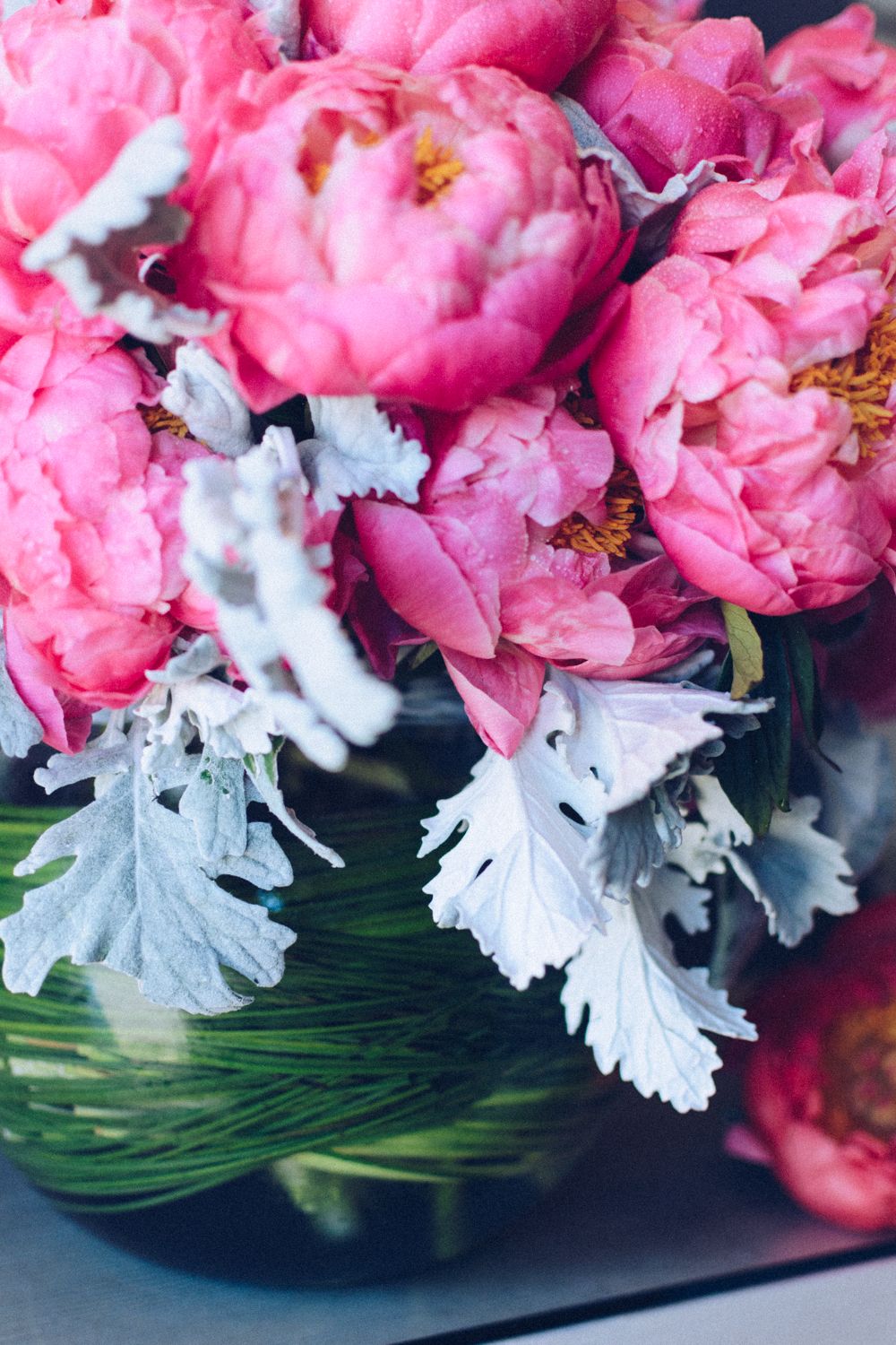 This visual masterpiece appears as if overflowing with 25 vibrant peonies in full bloom. Coral charm peonies feature deep coral buds that blossom out to large semi-double flowers with a slightly sweet fragrance. Accompanied by an abundance of silvery gray dusty miller foliage, the contrast is striking. Green steel grass twines, visibly submerged within the 8" tall circular glass vase. This breathtaking design stands at approximately 16" tall and 19" wide overall.
