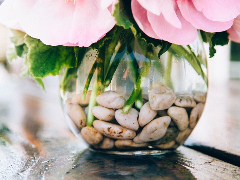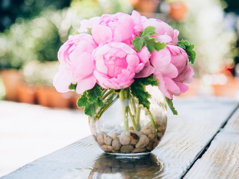 This simple arrangement lets the beauty of cotton candy pink Peonies shine. Resting inside a 6 inch by 6 inch glass vase, these airy blooms need not much more than neutral toned river rocks to accent their ethereal beauty. Overall, this arrangement stands at approximately 11 inches tall and wide.