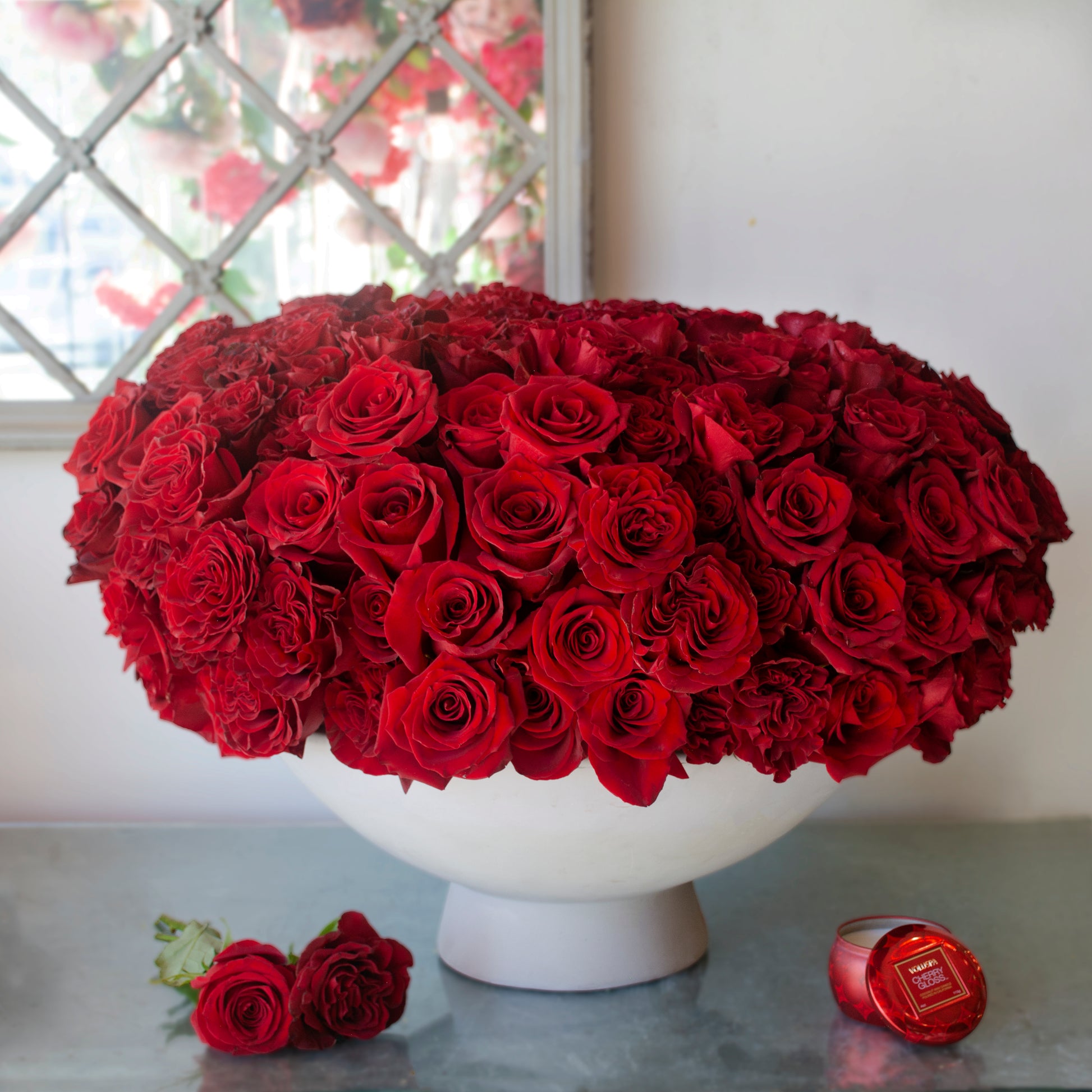 Immerse yourself in a sea of deep red hues, where each petal narrates a story of passion and refinement. Crimson Cascade is not just a floral arrangement; it's a visual symphony that fuses timeless elegance with the wild romance of garden-style red roses. Transform your surroundings with the grandeur of this 21-inch wide spectacle, where every inch is adorned with the lush beauty of meticulously arranged 200 red roses.