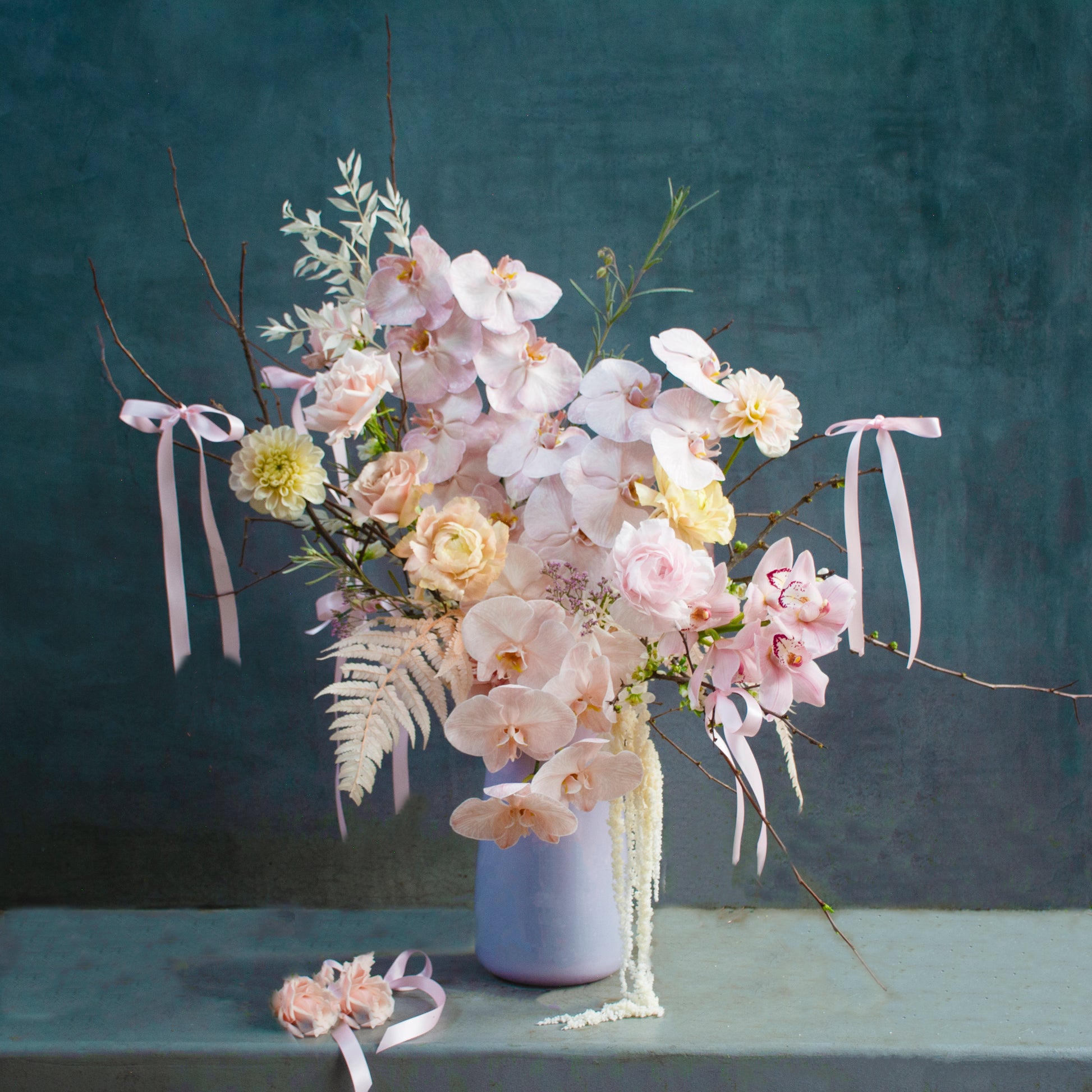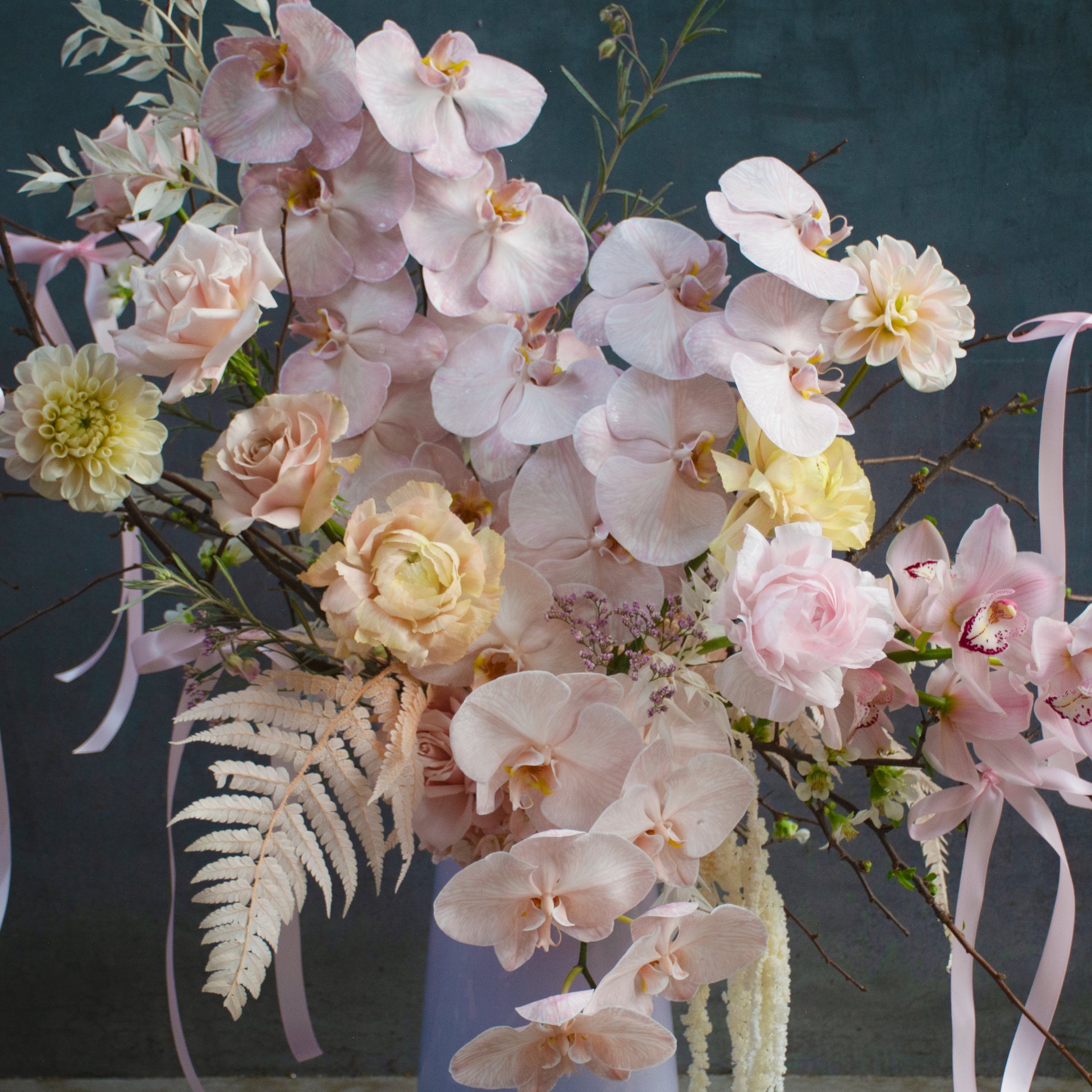 Discover the epitome of elegance with our exquisite soft pink floral arrangement. Immerse yourself in the delicate beauty of chocolate lace orchids at the center, surrounded by the graceful presence of pink cymbidium orchids. On one end, a harmonious ensemble of soft pink roses, lisianthus, and yellow dahlias blooms with charm. A whimsical trail of white amaranthus, Italian ruscus, and dried leaves adds a unique flair to this enchanting creation. Behold the artistic arrangement where cherry blossom branches gracefully spread in the background, adorned with pink ribbons delicately tied. Standing tall at 25 inches and boasting a width of 14 inches, this masterpiece is a testament to refined taste and floral artistry.