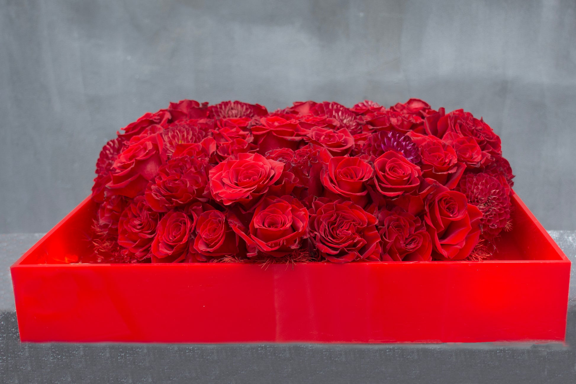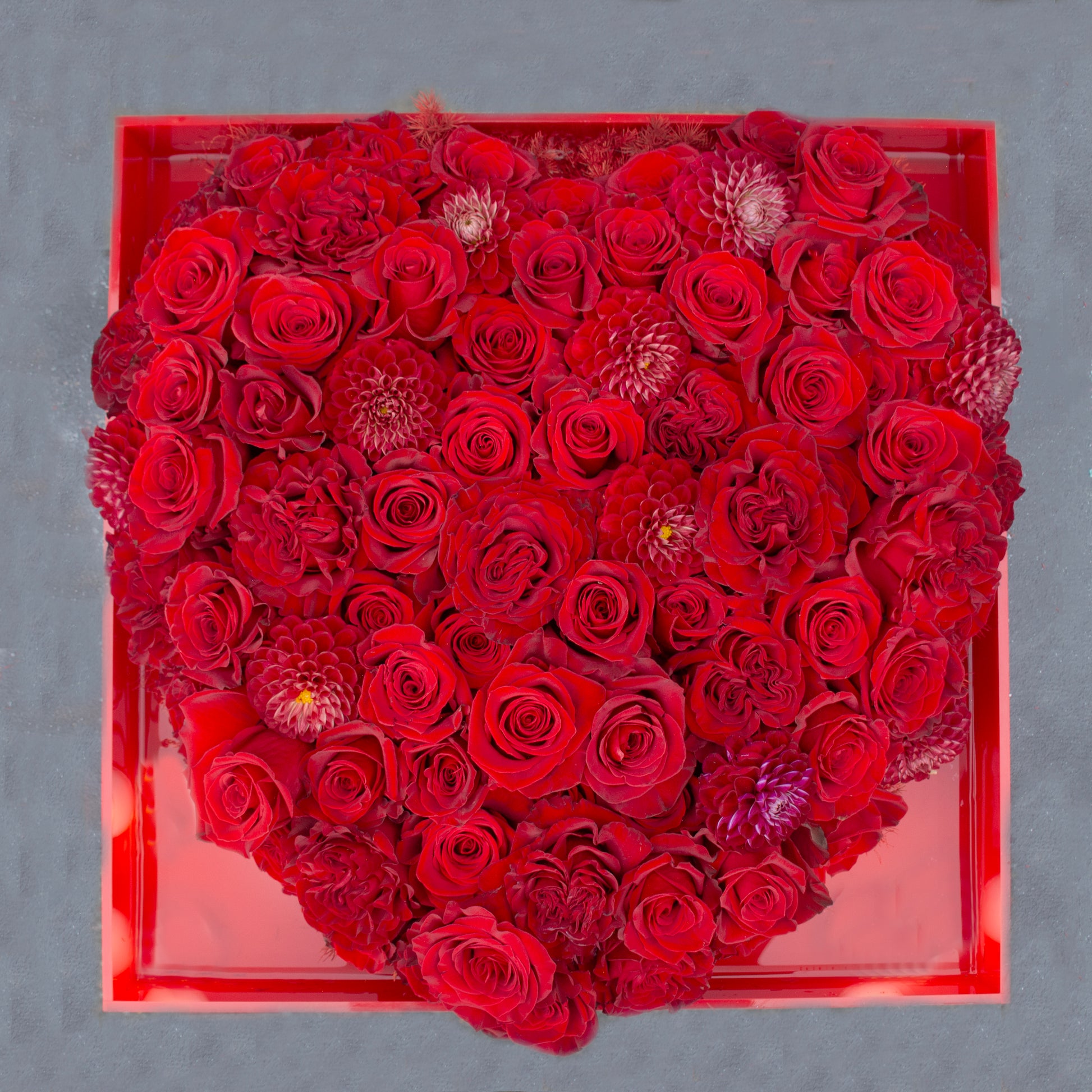 Make a bold declaration of love with this striking heart-shaped floral arrangement, designed to stop hearts and turn heads. Crafted in a modern 20” x 20” red plexiglass container, this piece features a sculptural red heart composed entirely of premium red roses, red heart roses, and lush red dahlias. Each bloom is meticulously placed to create depth, texture, and an unmistakable sense of passion.