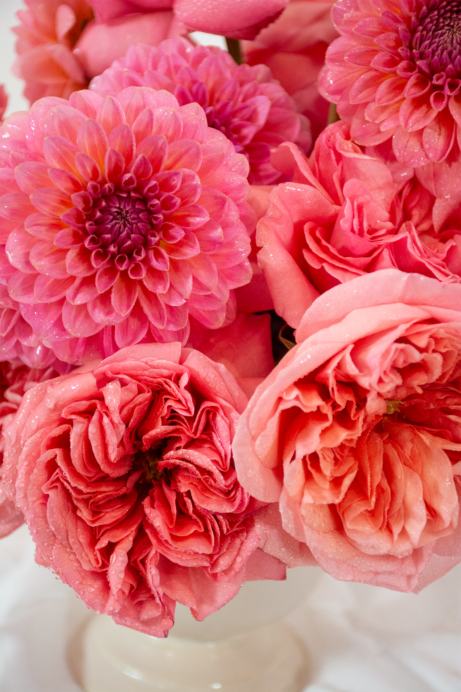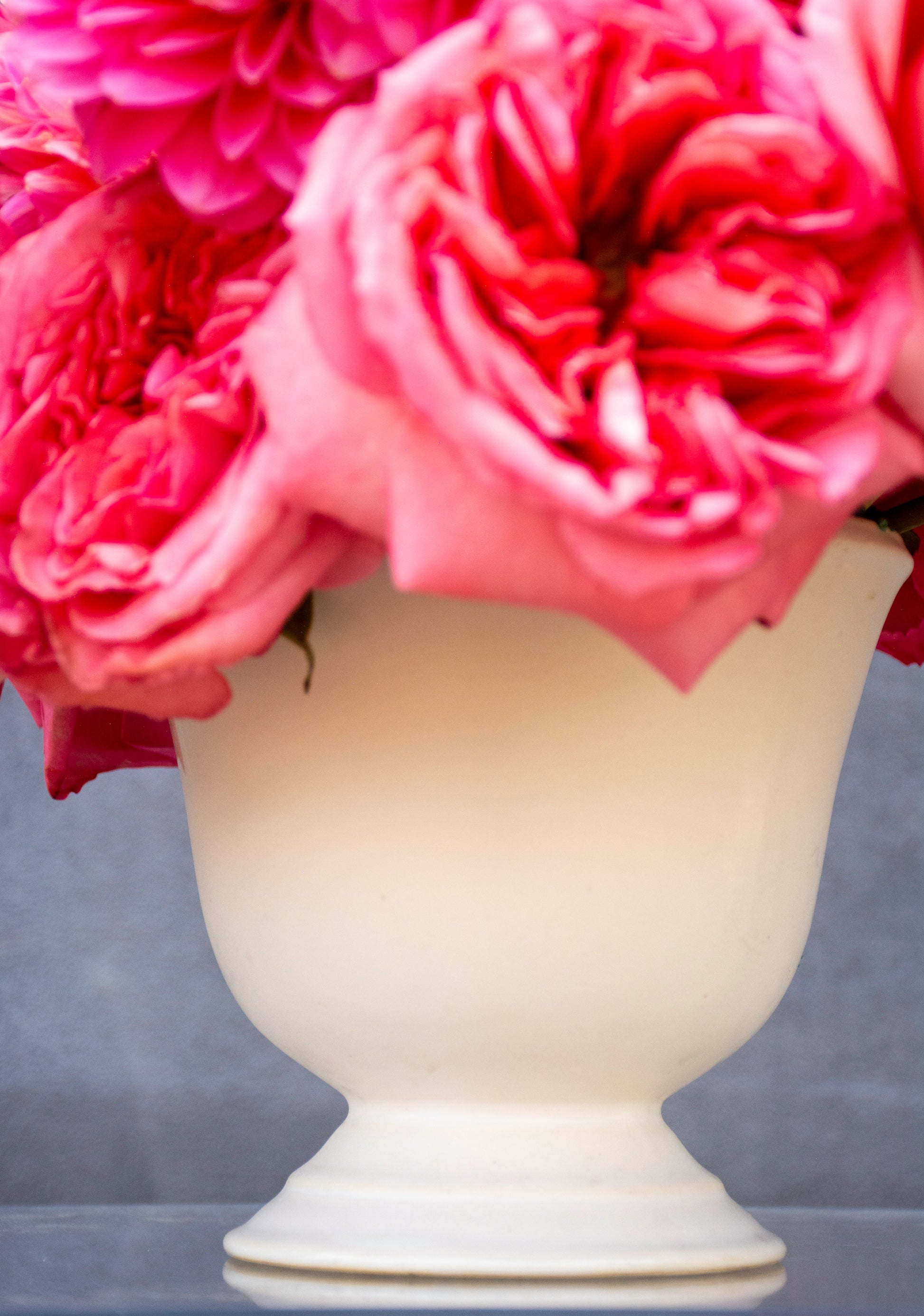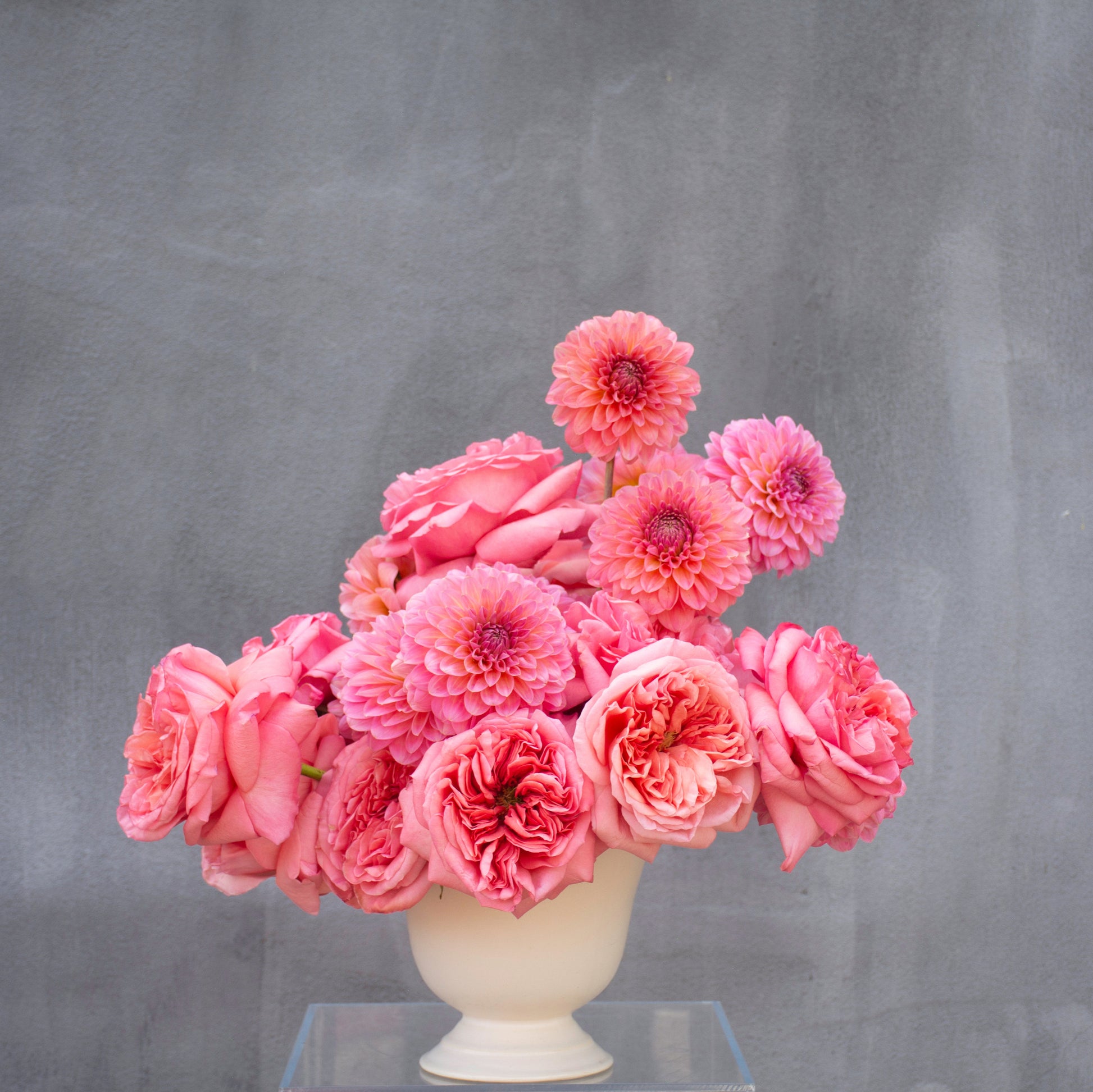 Cerise Serenade is a floral design where dahlias and roses find their perfect dance. Here, pompom Dahlias with their intricate layers nestle against the generous, open hearts of Garden Roses, creating a tapestry of texture and tone. The colors flow like watercolor on silk with each bloom carefully placed in a soft-cream pedestal vase measuring approximately 4 1/2 inches tall, with the full arrangement measuring approximately 12 inches tall and 14 1/2 inches wide. .