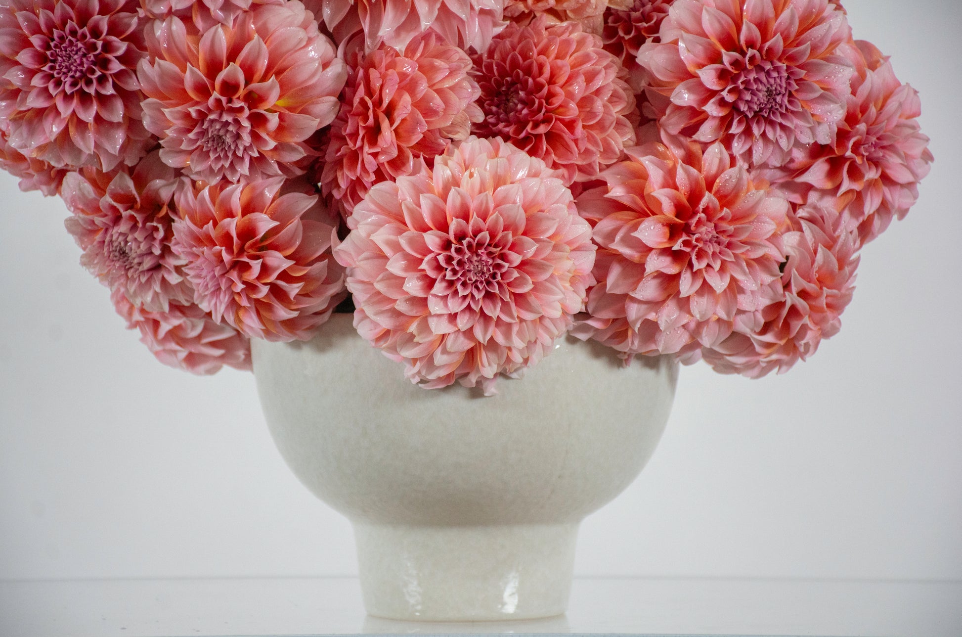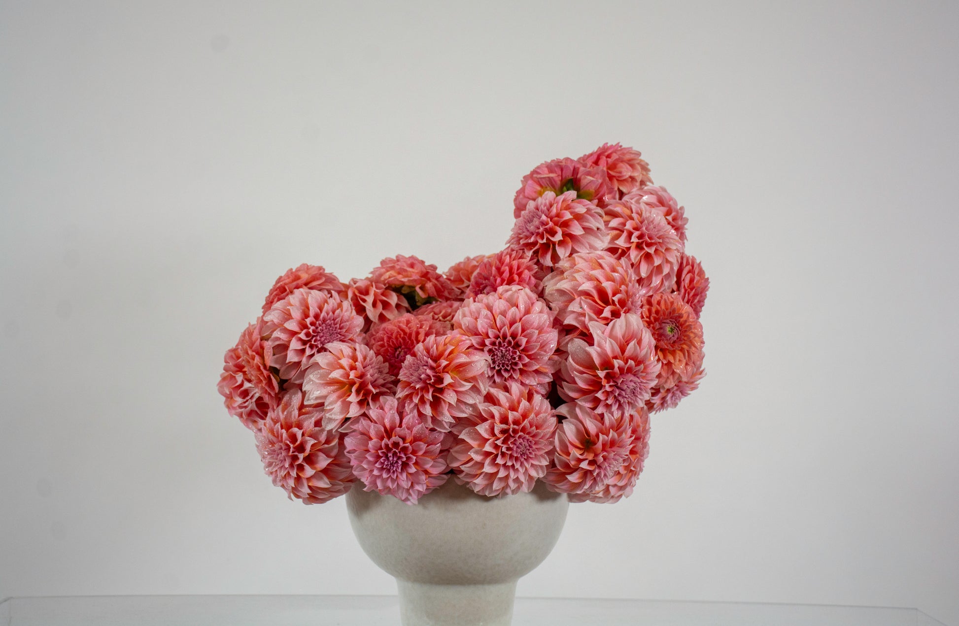 Darling Dahlias features pompom up to fifty dahlias that range from light to deep pink hues. Each bloom unfurls its ruffled layers with theatrical flair, creating a bouquet that's equal parts vintage charm and modern romance. Nestled in a soft-cream pedestal vase measuring approximately 4 inches tall, with the full arrangement measuring approximately 16 1/2 inches tall and 16 inches wide.