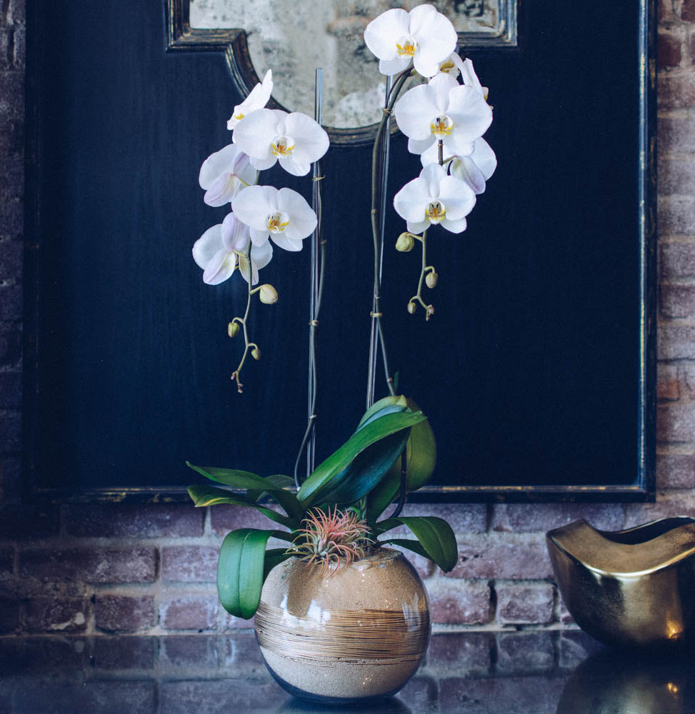 Two stunning phalaenopsis stems stand tall within a 6" tall circular vase, filled to the brim with layers of metallic gold sand and metallic gold middolino finished with the perfect accent of a tillandsia air plant. The arrangement stands at approximately 31" tall overall. *Please note that orchid stems will vary in height.*