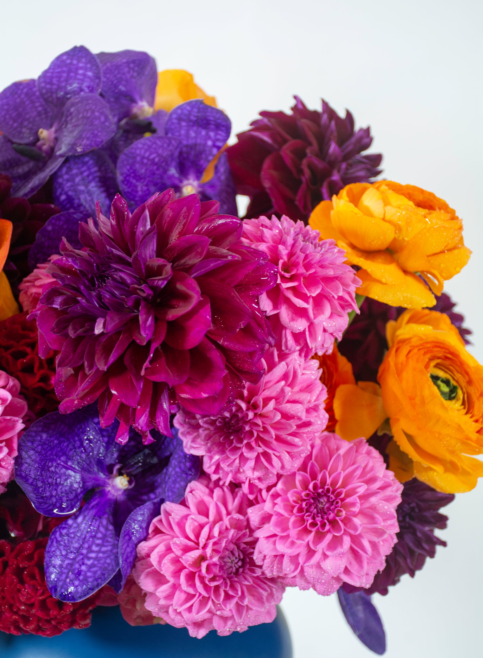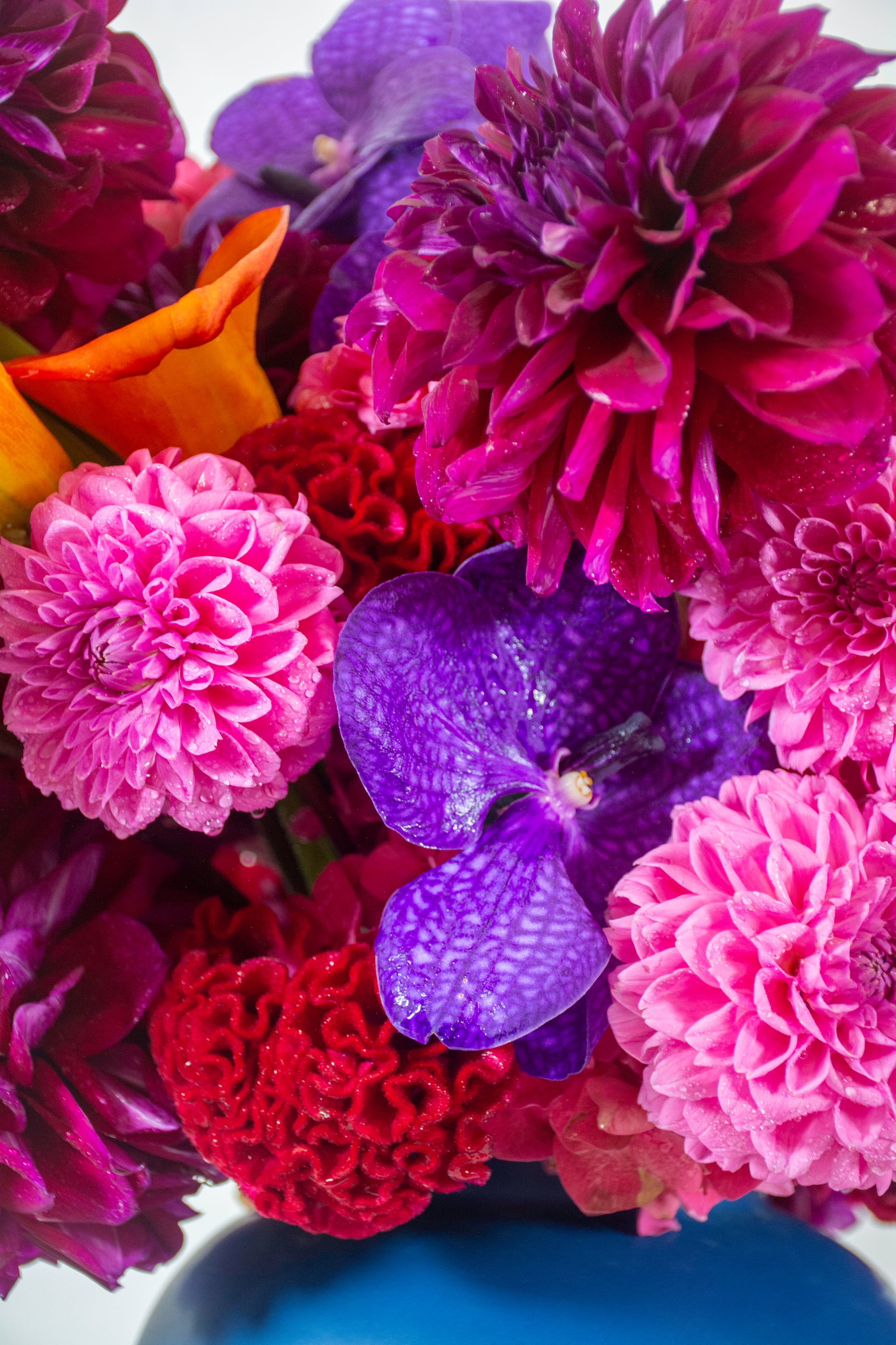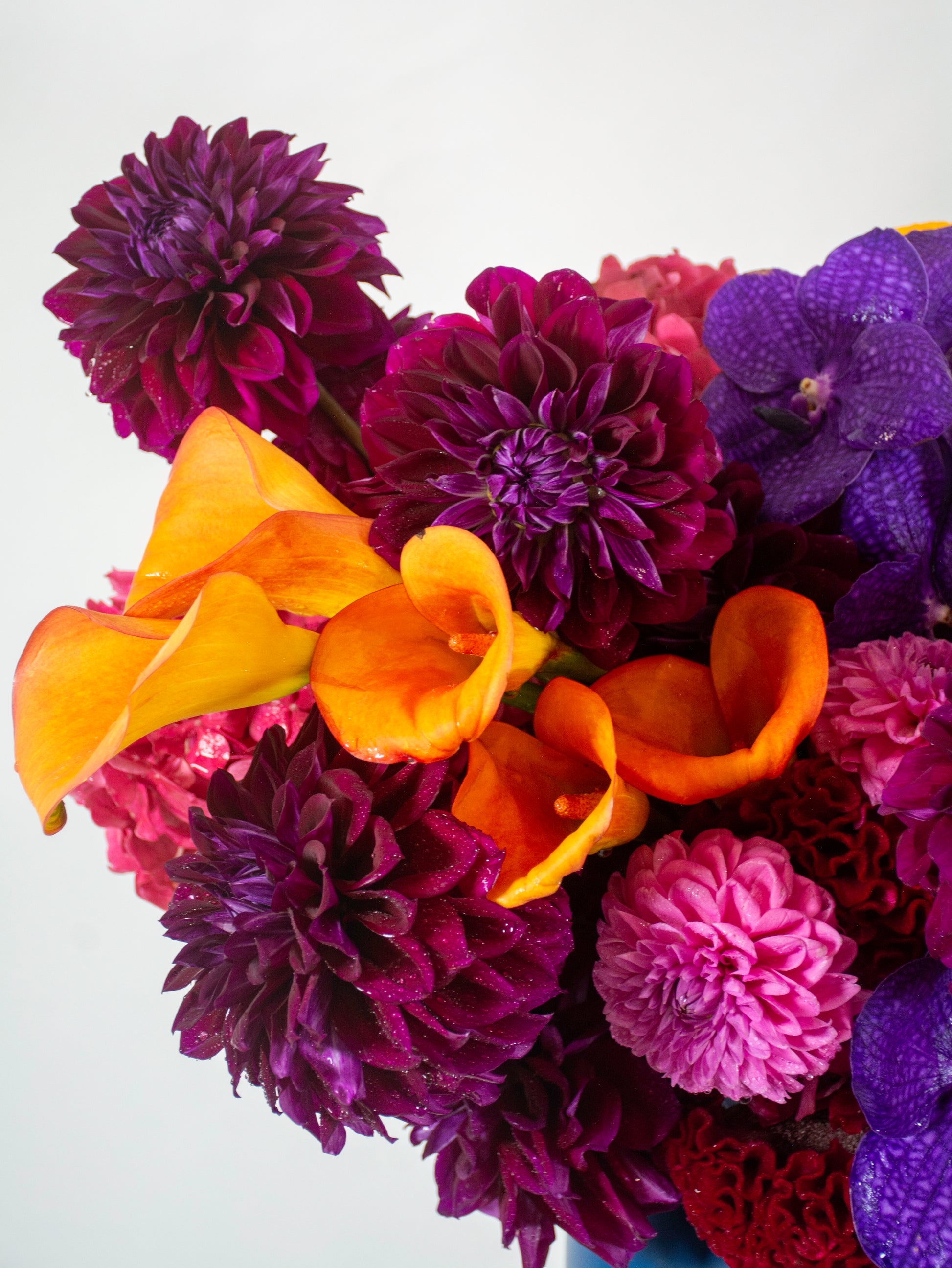 Mulberry Street brings together vibrant pink and purple Dahlias, orange-yellow Calla Lillies, purple Phalaenopsis Orchids, pops of orange Ranunculus, deep red Cockscomb, and bunches of pink Hydrangeas. This floral design is carefully held together in a matte blue vase and comes accompanied by the vase's fitted top.