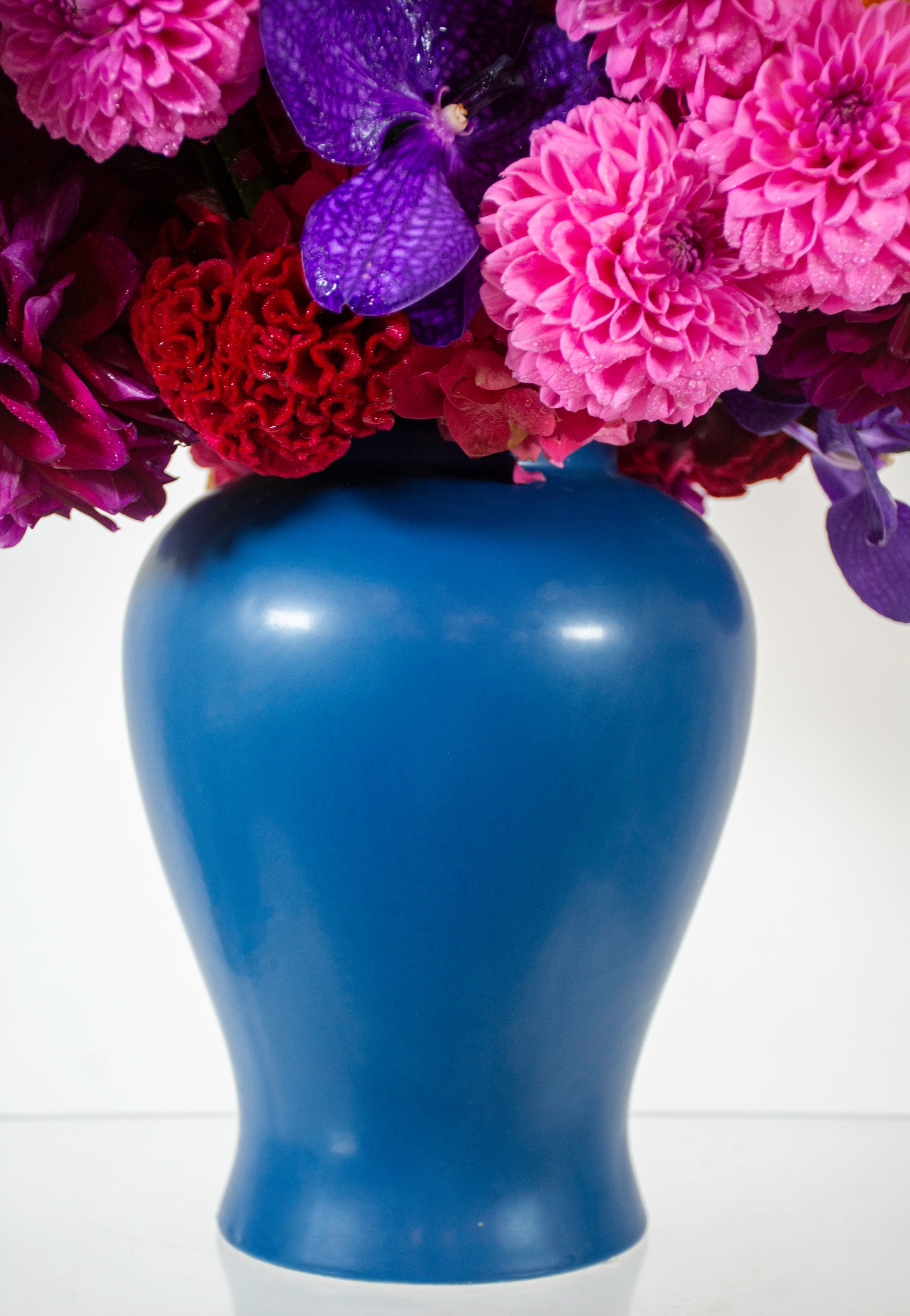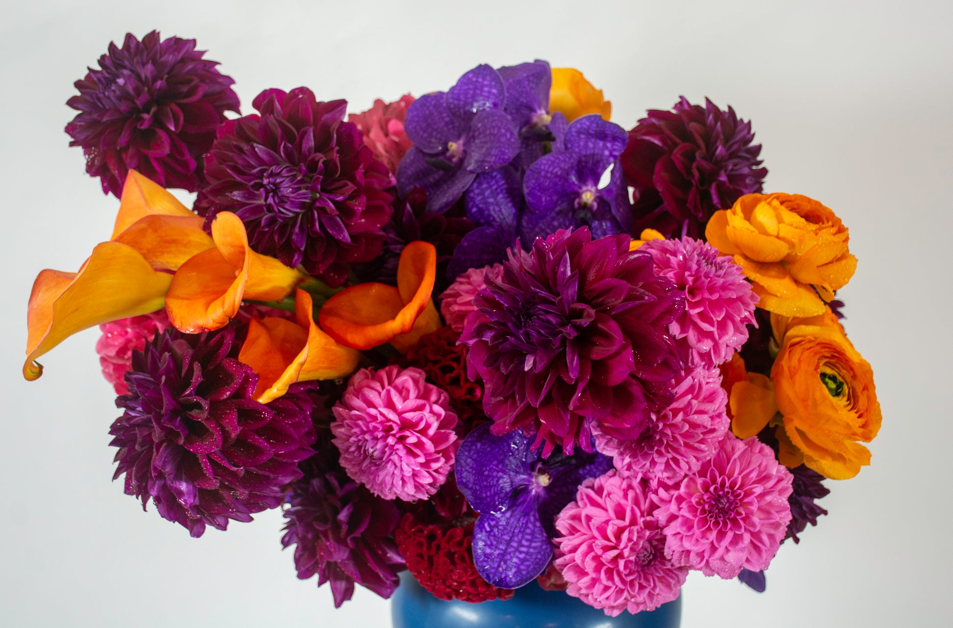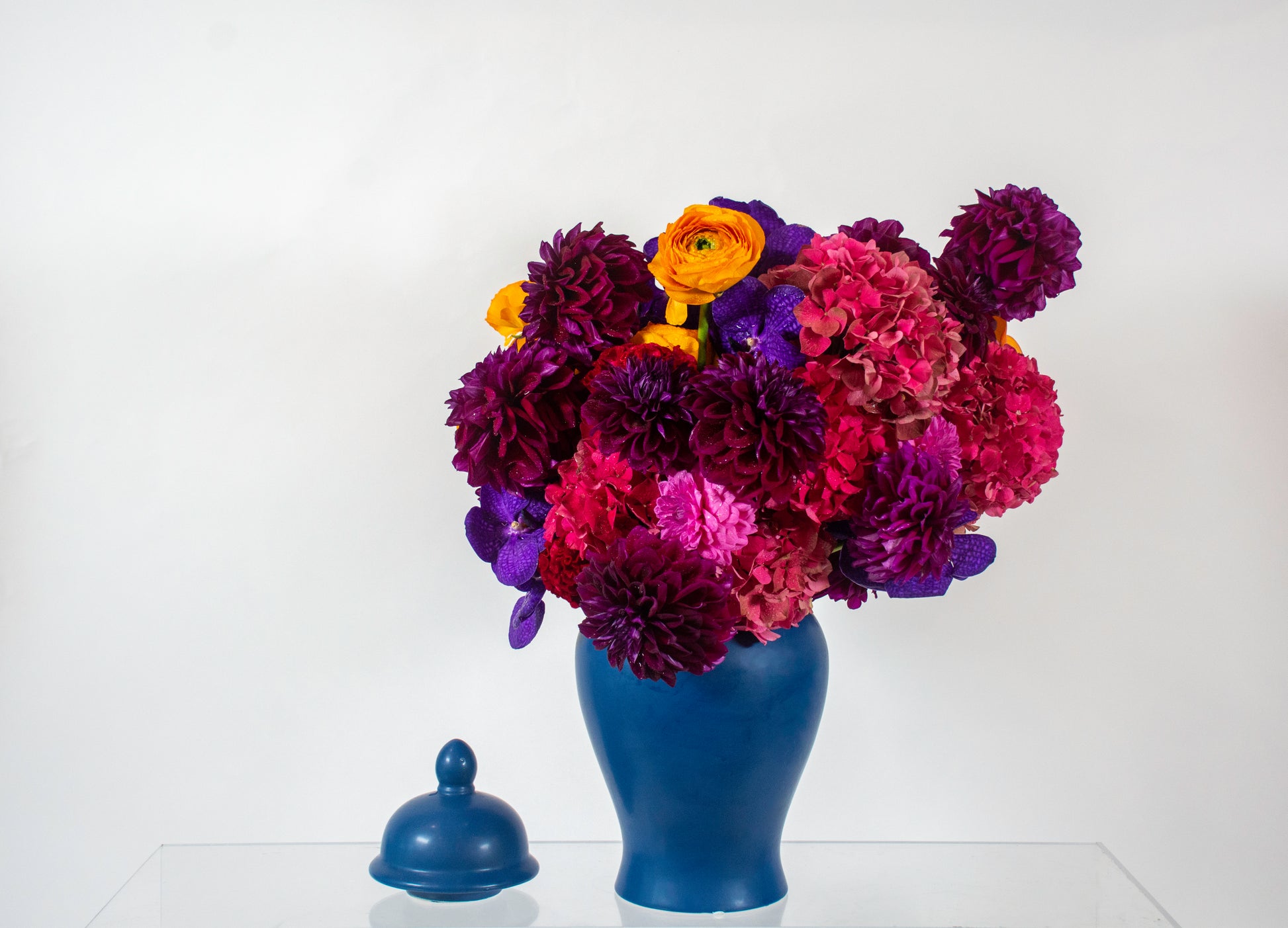 Mulberry Street brings together vibrant pink and purple Dahlias, orange-yellow Calla Lillies, purple Phalaenopsis Orchids, pops of orange Ranunculus, deep red Cockscomb, and bunches of pink Hydrangeas. This floral design is carefully held together in a matte blue vase and comes accompanied by the vase's fitted top.
