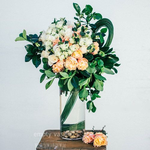 Delicate spray roses are paired with peach colored garden roses with accents of gardenia leaves. The 16” glass cylinder is encircled by a band of ti leaves at the top. Decorative middolina wire extends from the top of the arrangement down into the base of the cylinder where it rests upon smooth river rocks. This arrangement is approx.. 28” tall.