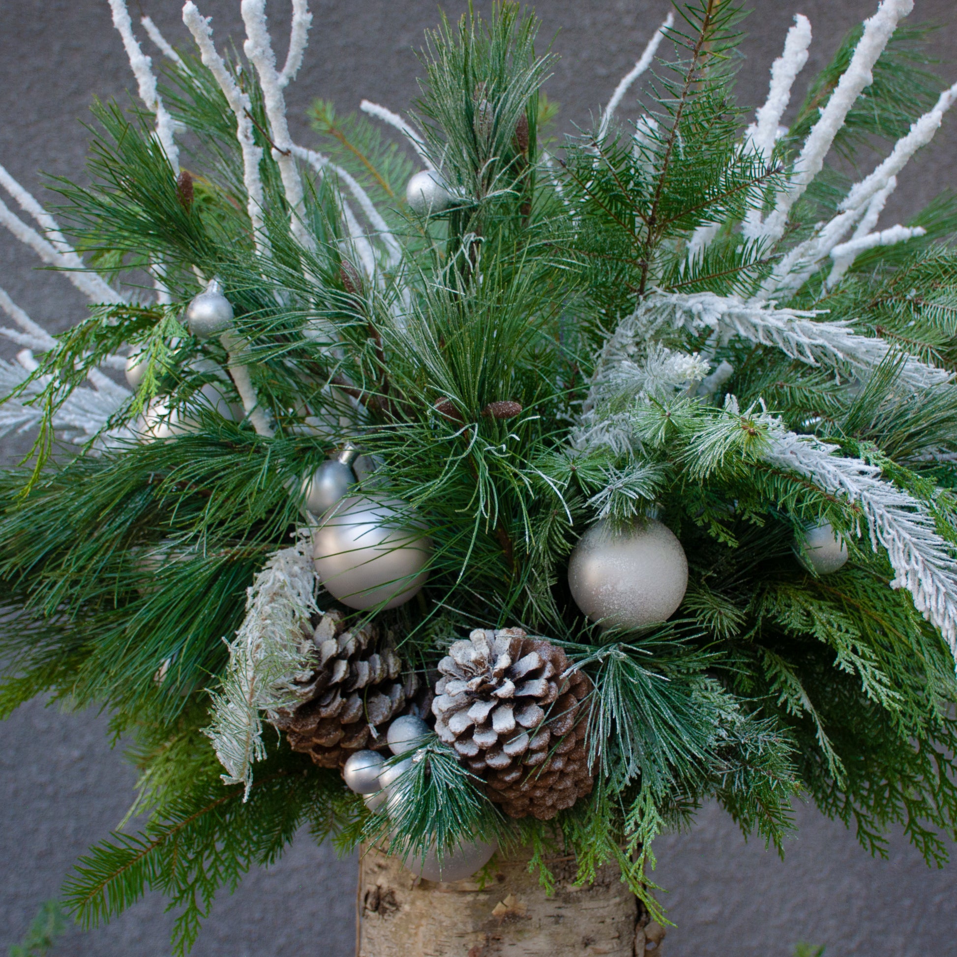 Experience the magic of the season with Emerald Forest, a stunning Christmas arrangement inspired by nature's winter beauty. Fresh green pines burst from a birchwood-wrapped cylinder vase, exuding rustic elegance. Accented with shimmering silver ornaments, snow-dusted branches, and frosted pinecones, this arrangement captures the essence of the holidays. Towering at 37 inches tall and spanning 30 inches wide, it's a show-stopping centerpiece for your festive celebrations.