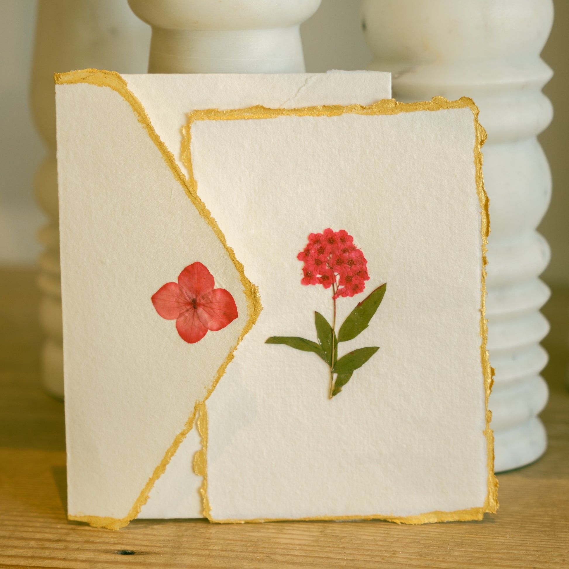 Share your emotions with the power of flowers. These hand-painted greeting cards with golden edges add a poetic touch to any gift with real pressed flowers. Each card is created in our Los Angeles store using hand-made cotton paper. Cards includes an envelope adorned by a matching flower and a golden sticker to seal it.