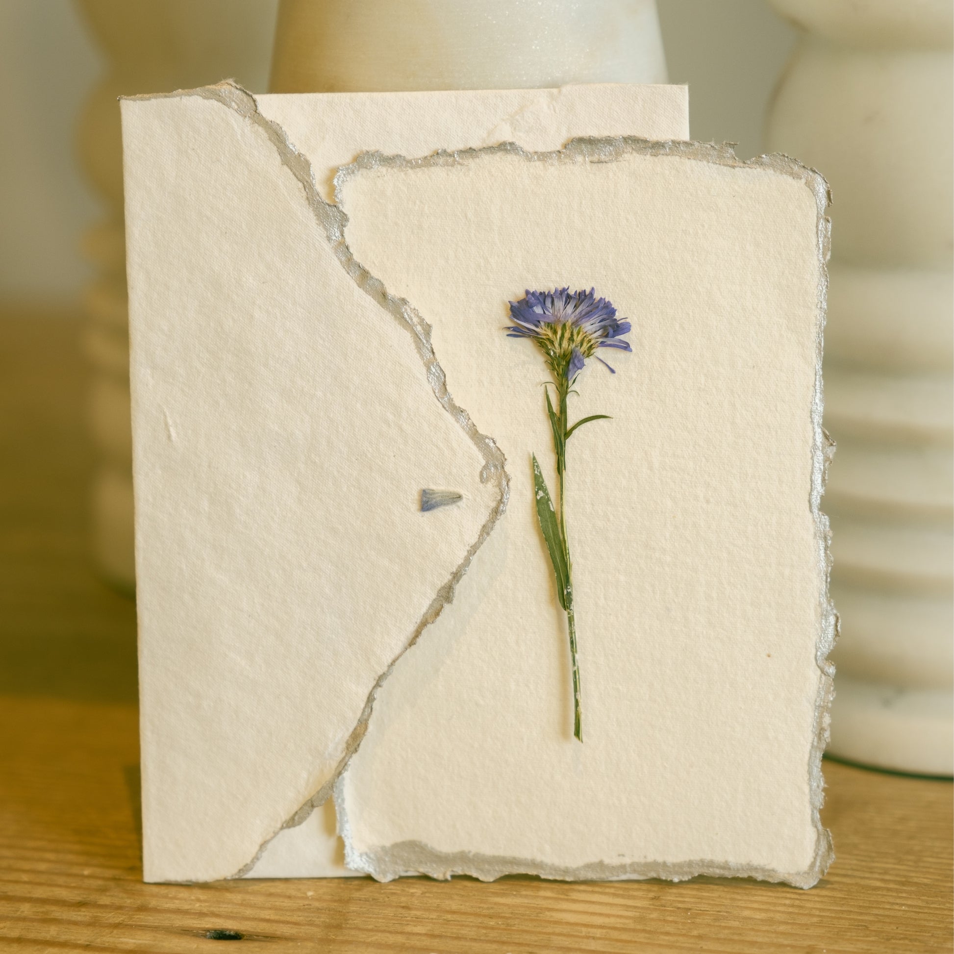 Share your emotions with the power of flowers. These hand-painted greeting cards with silver edges add a poetic touch to any gift with real pressed flowers. Each card is created in our Los Angeles store using hand-made cotton paper. Cards includes an envelope adorned by a matching flower and a golden sticker to seal it.