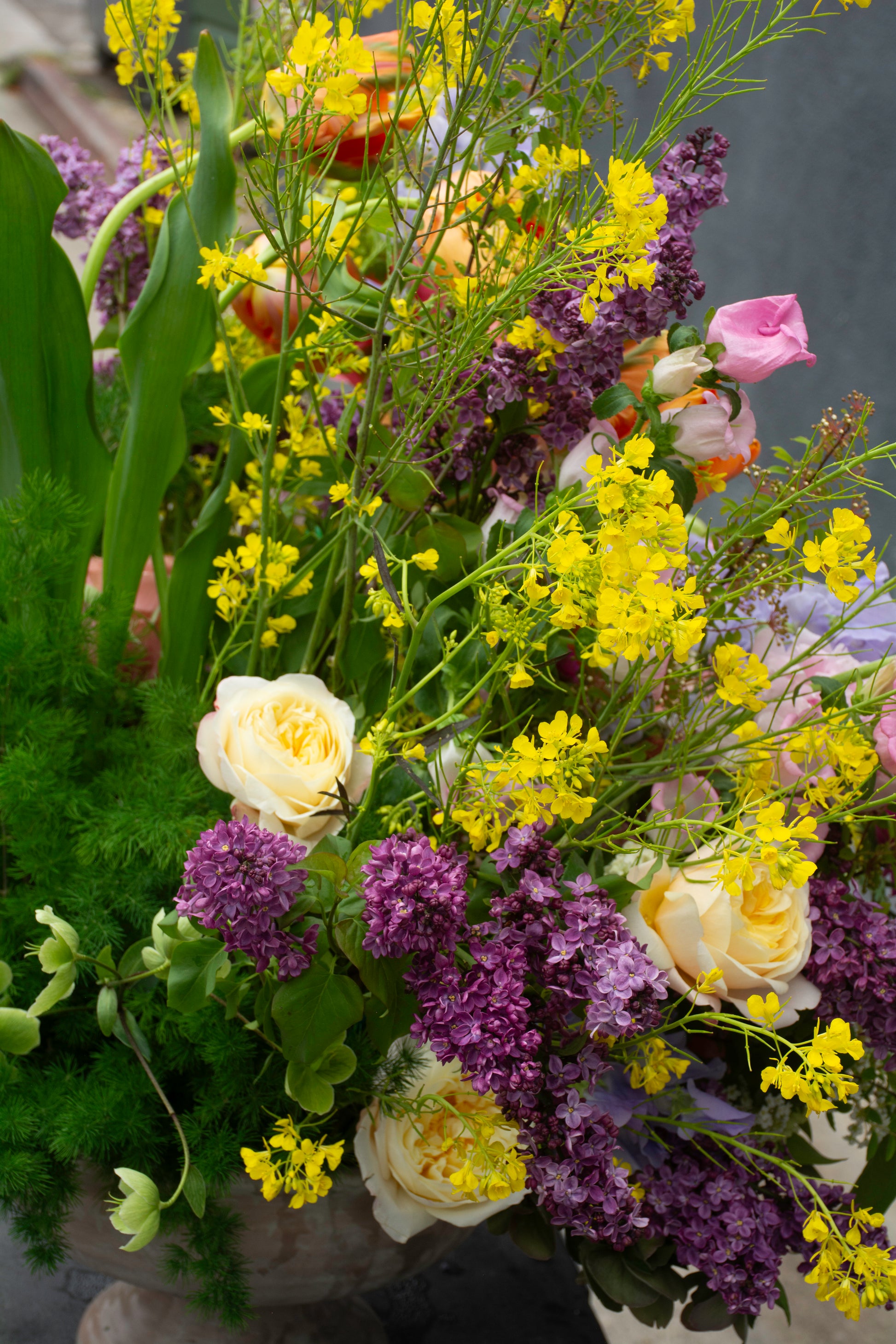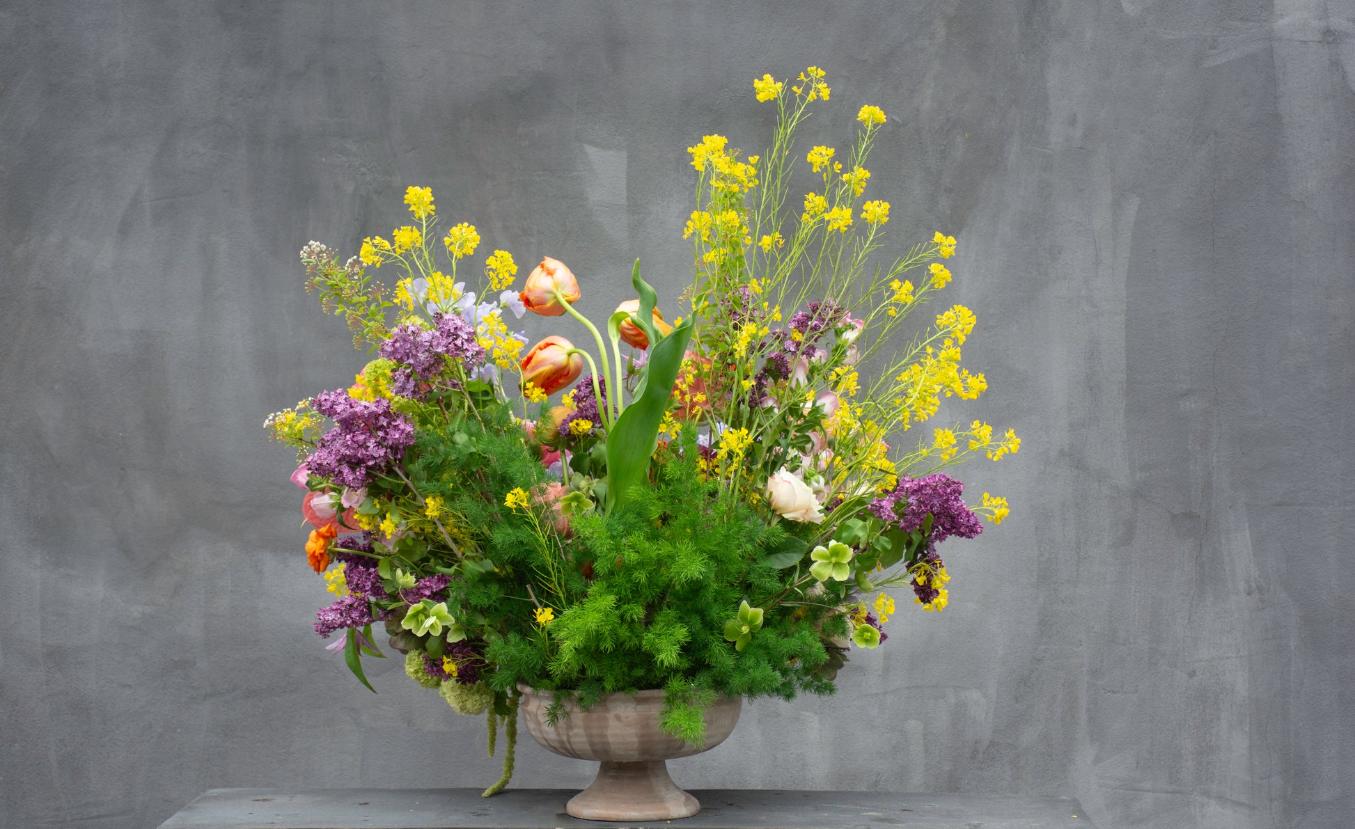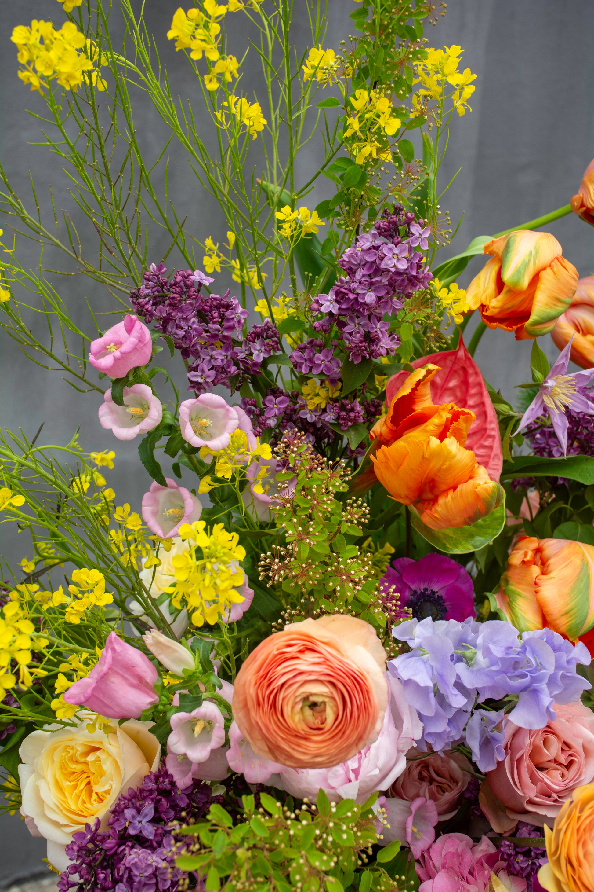 In a magnificent celebration of color and texture, Enchanted Euphoria features a lavish touch of bright yellow mustard flowers and purple Lilac clusters that adorn the arrangement, allowing Spring's best blooms to shine, including lush Ranunculus, playful Anemones, blooming Peonies, peachy-orange French Tulips, bubblegum pink Anthuriums with stripes of green, poppy Clematis, vibrant Dahlias, pillowy Hydrangeas and Viburnums, light purple Sweet Peas, white Garden Roses, and show-stopping hanging lime green Amaranthus. All gently held in a weathered custom pedestal bowl measuring 10 inches wide, with the full design standing at approximately 35 inches tall and 32 inches wide.