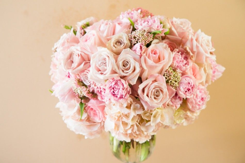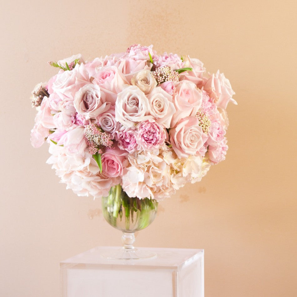 This classical and stunning arrangement is the match to your blushing soul. Lush pastel tones can be seen in delicate hydrangeas, ivory rice flowers and pink spray roses. Resting inside a beautiful 7” by 5” April glass pedestal, overall this arrangement stands approximately 12" tall.