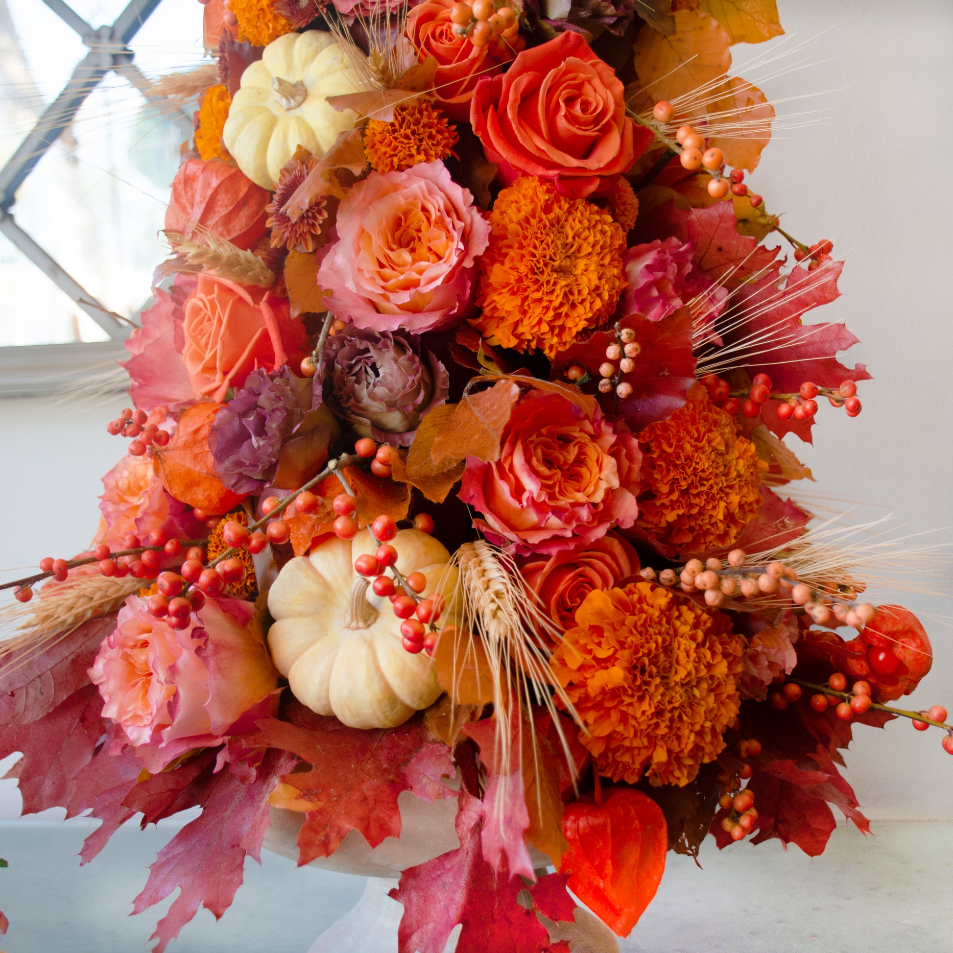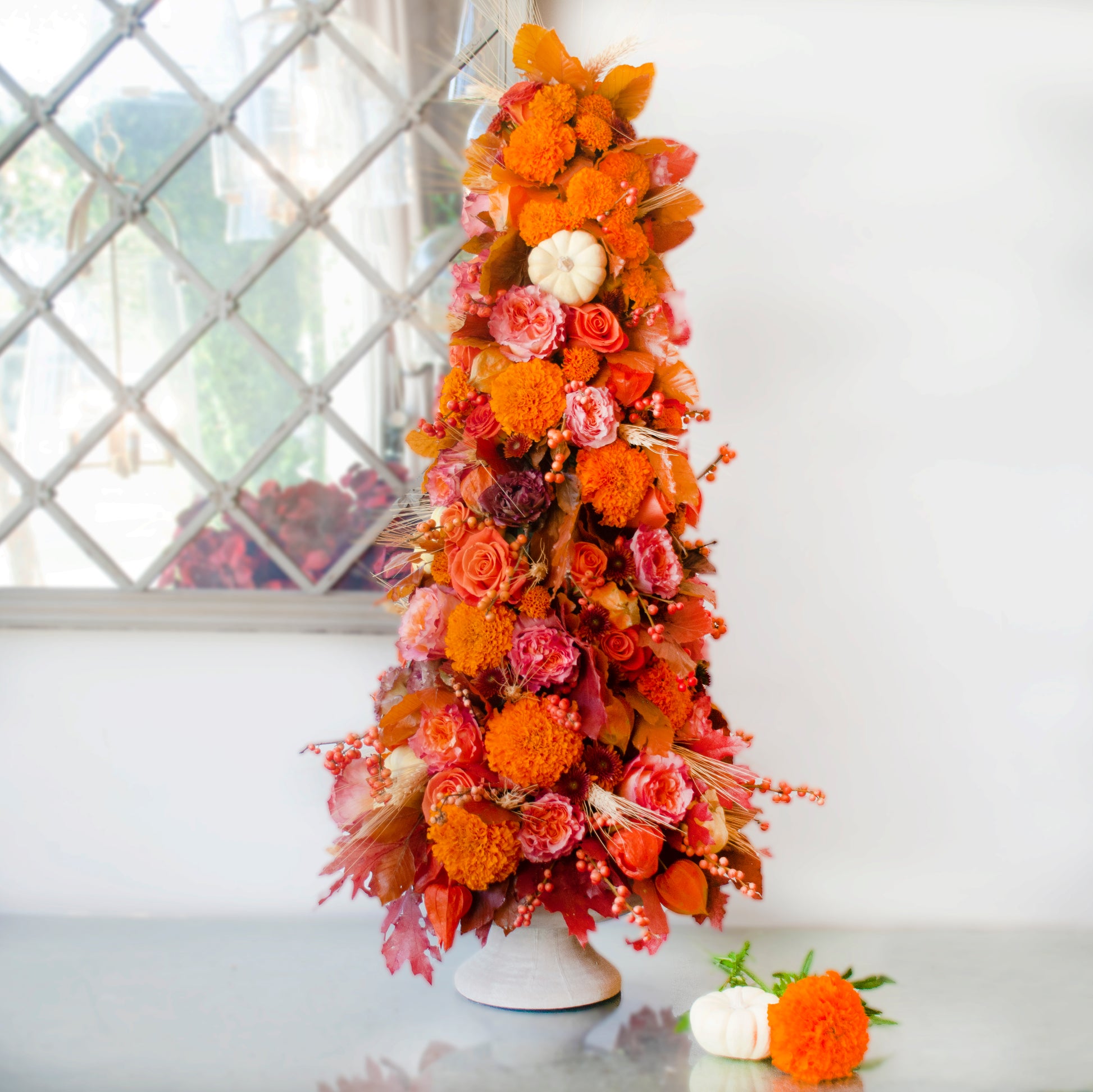 Celebrate the splendor of Autumn with our stunning Fall Spire centerpiece. Sculpted into a pristine white pedestal vase, this radiant orange tree embodies the fire of the season. Vibrant orange Marigolds, peach-pink ombré Free Spirit roses, fiery Orange Crush roses, wine colored Lisianthus, and delicate mini Daisies compose this flame of Autumn, accented by seasonal foliage, berries, dried wheat and Chinese Lanterns. This emblem of the natural beauty of Fall stands at an impressive 31 inches tall.