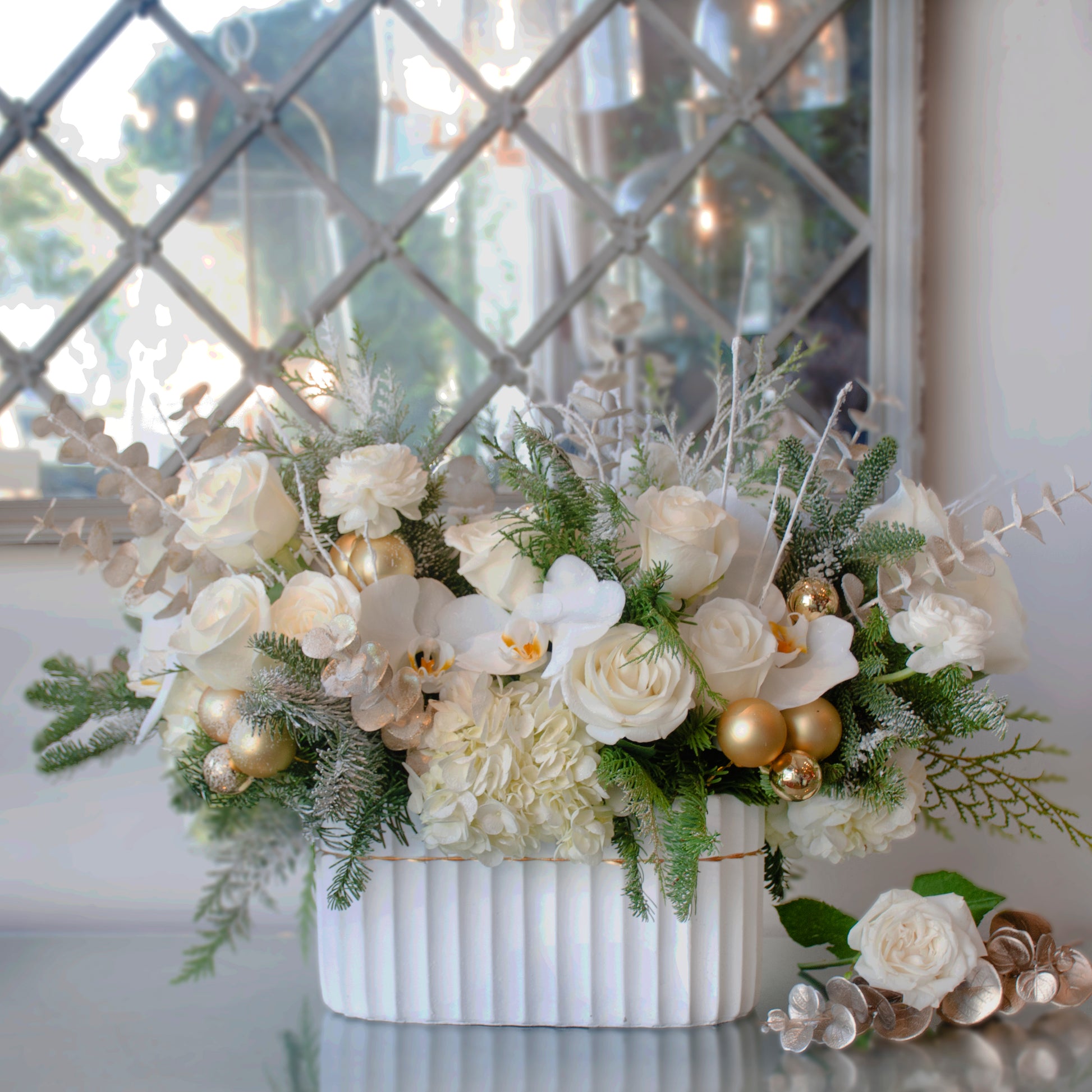 Experience an enchanting ensemble featuring a delightful mix of premium white blossoms. Immaculate white roses gracefully intermingle with delicate white ranunculus, white orchids, and hydrangeas. Complemented by the lush presence of fern pine, micro noble fir, and glistening Christmas ornaments, this arrangement embodies an extra layer of beauty. All nestled in an exquisite 15-inch tall and 17-inch wide textured white vase, this creation exudes elegance.