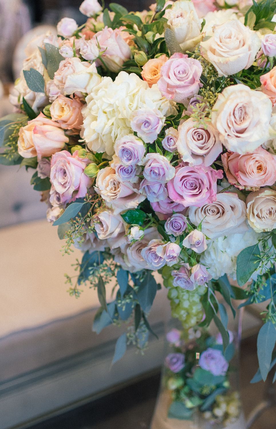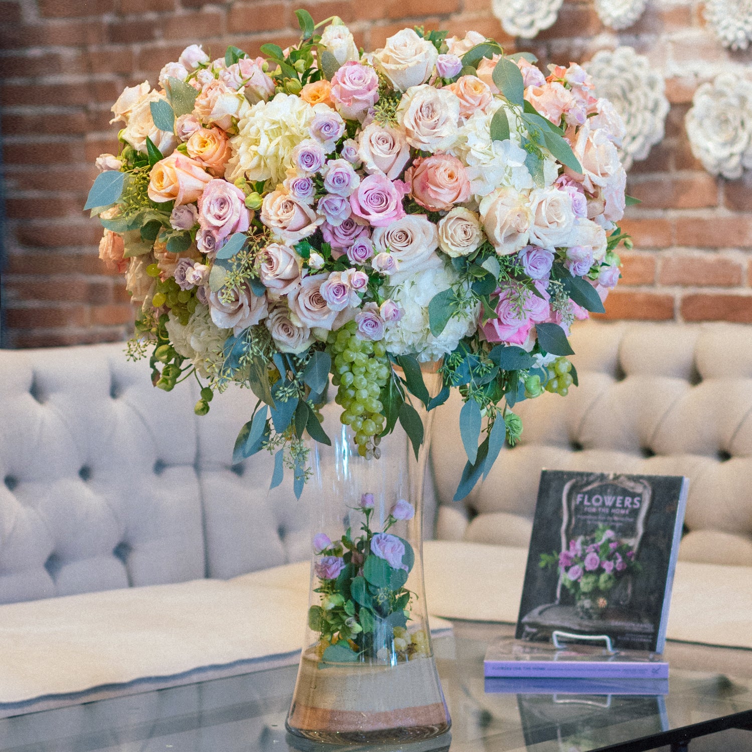 Sweet like honey, this delightful new design filled with roses almost seems to defy gravity. Artfully composted of quicksand roses, shimmer roses, faith roses, and winter roses, this pastel dream will take your breath away. Resting gracefully atop a 20" tall hourglass vase, this stunning arrangement stands at approximately 33" tall and 25" wide.