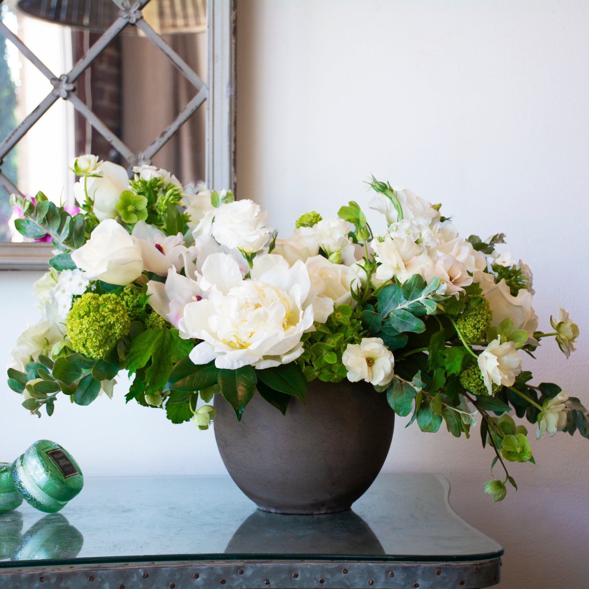 Whites & Greens - a classic. White lisianthus, peonies, and winter roses are complemented by garden-fresh eucalyptus, bouvardia, camellia foliage, and hydrangea. Spilling out of a 6" tall grey clay, round pot - this gorgeous arrangement will all life to any home.
