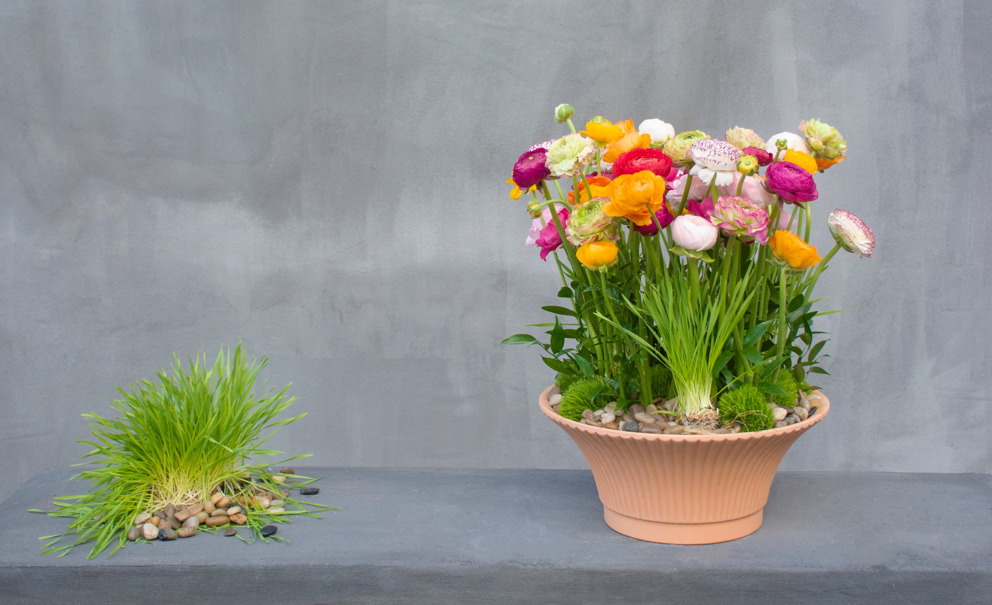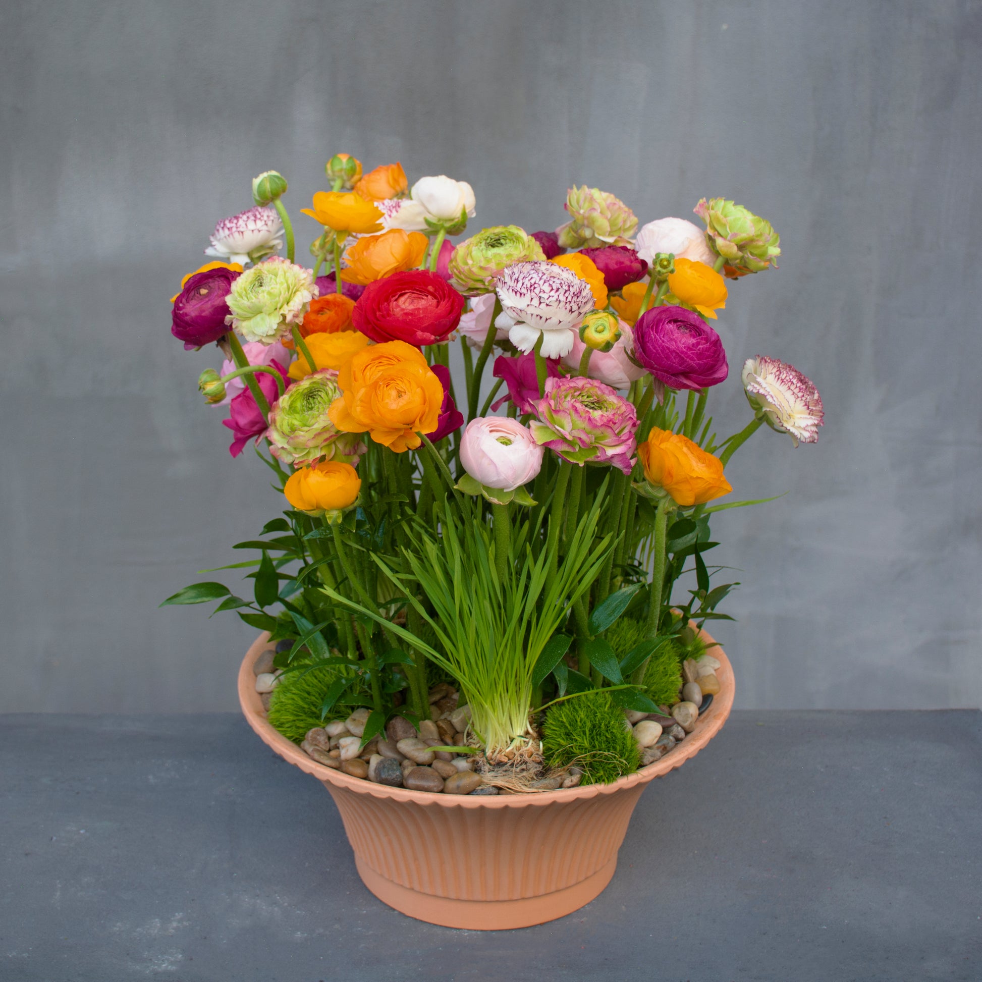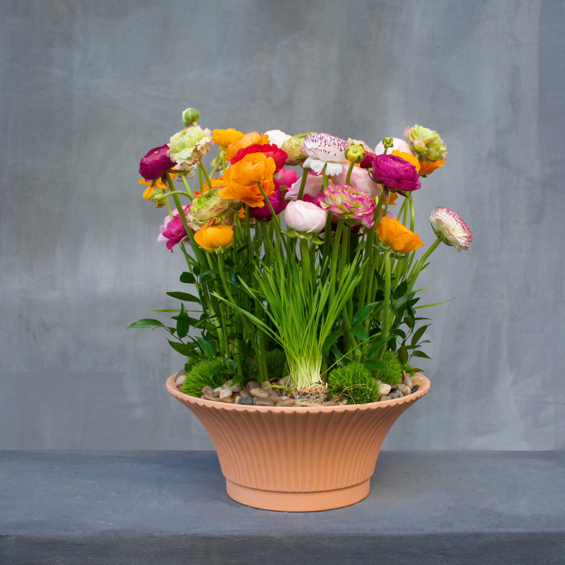 35-40 hybrid ranaculus in radiant shades of orange, hot pink, soft blush, and painterly multicolor hues blossom from a terra cotta-hued vessel, cradled by wheatgrass, mood moss, and river rocks — bringing the essence of a wild garden to life. Vibrant, lush, and endlessly charming, this arrangement makes every moment feel like spring. 17" tall x 12" wide