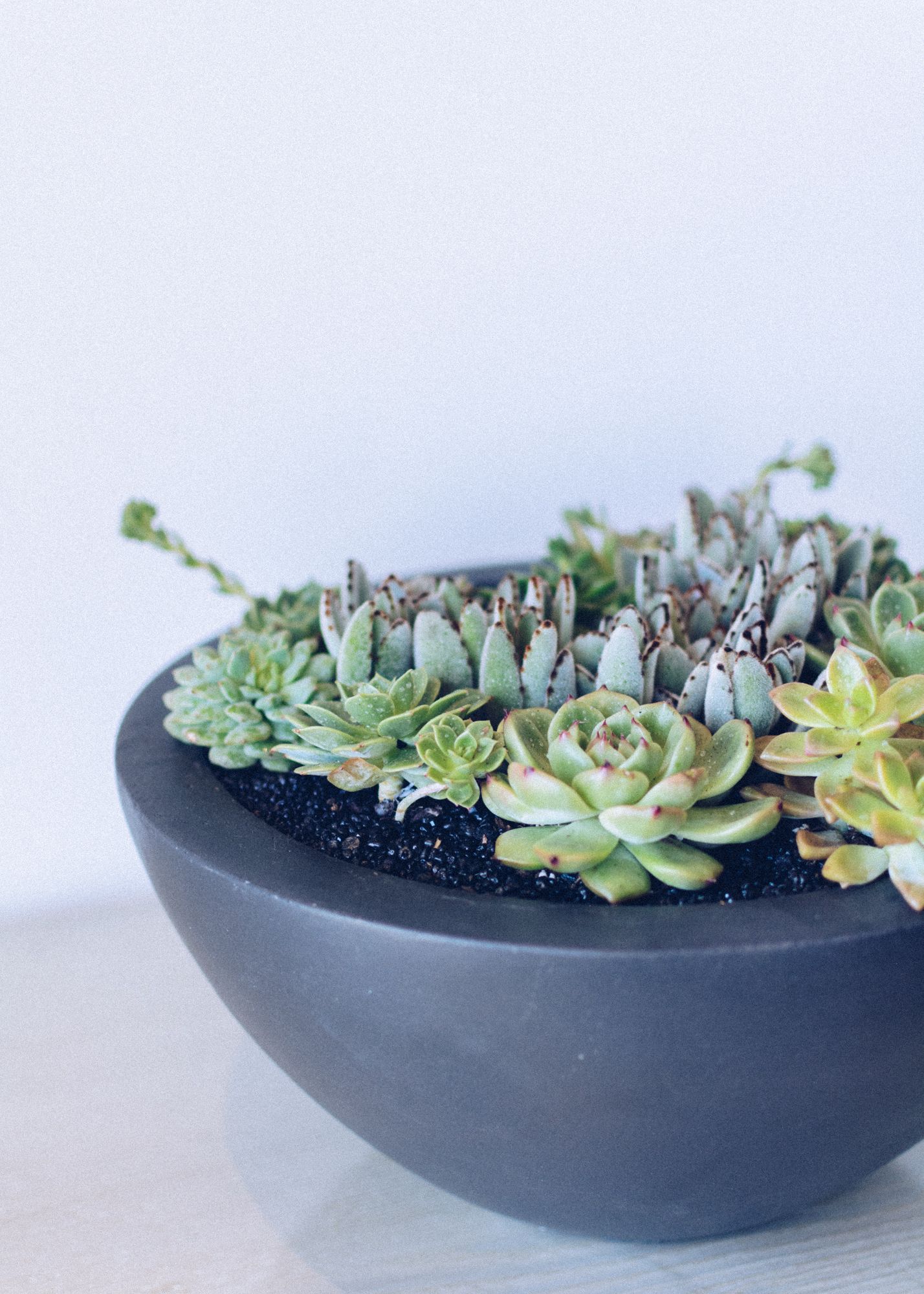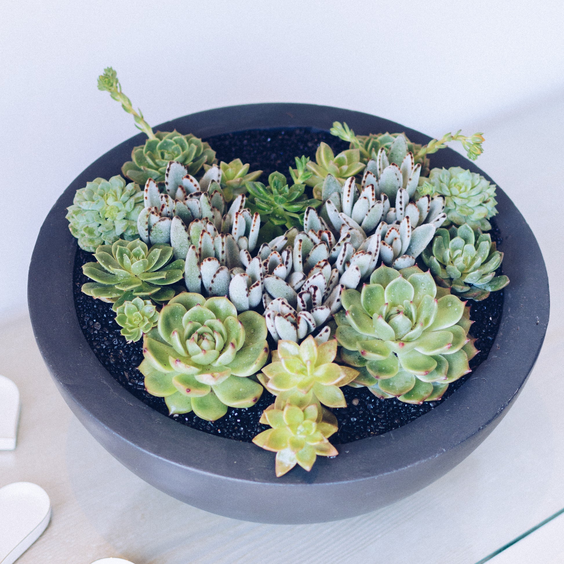 A romantic gesture with a unique approach, this stunning private garden features a beautiful medley of hand selected succulents arranged in a sweet heart shape. This lush and modern design rests within a 7" tall by 14" wide grey designer vase.