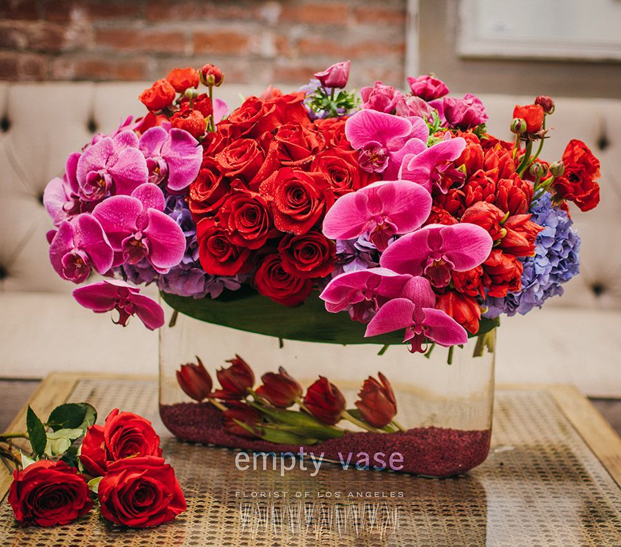 This charming arrangement combines the classic beauty of red roses and tulips with the bold colors of phalaenopsis orchids, hydrangeas, ranunculus, and anemone in a 15”x 10” glass vase containing decorative red gravel and six red tulips. This arrangement is approx. 18” tall.