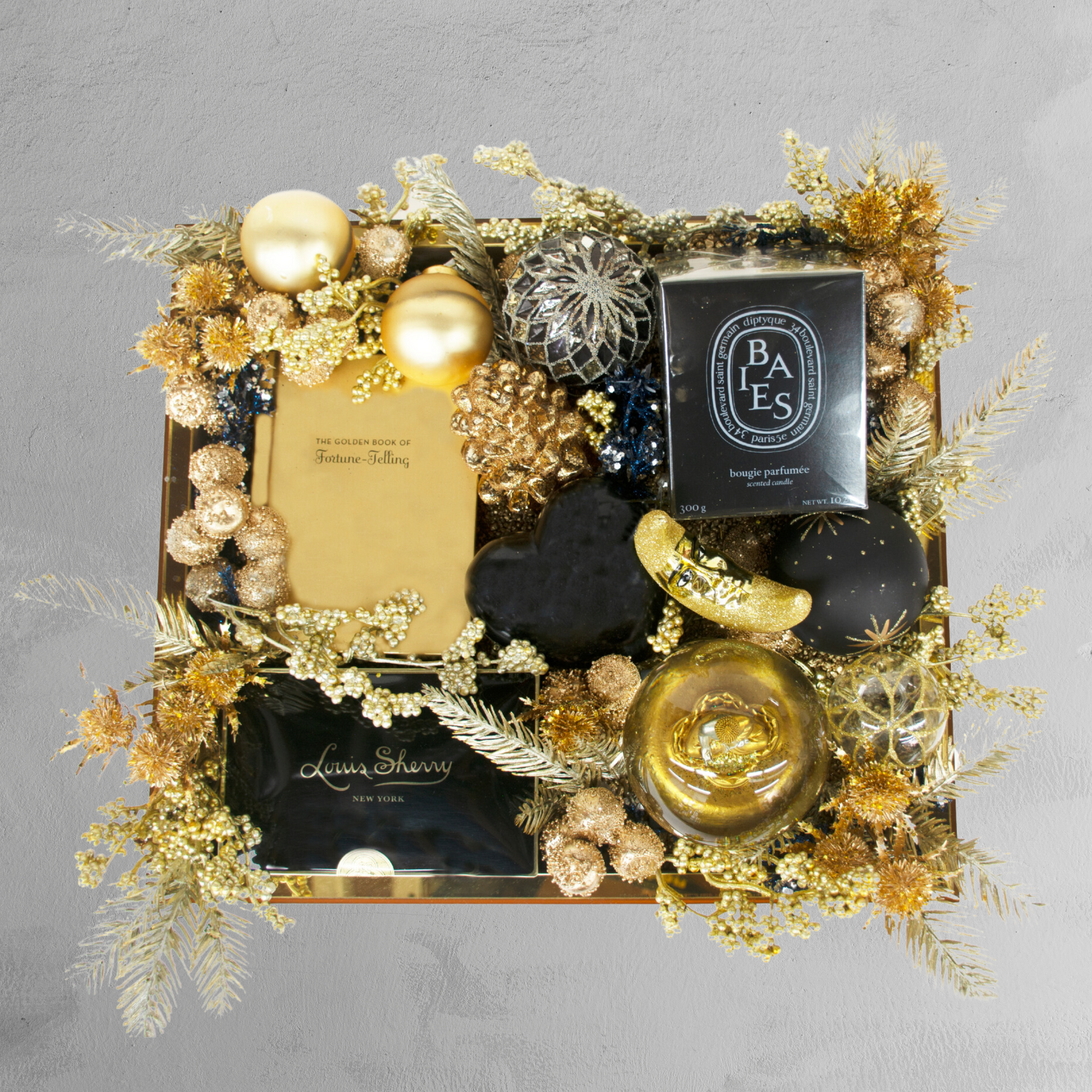 This luxurious Holiday Box comes in a glamorous gold mirrored tray (14 x 16) with specially curated gift items by our team. Artfully decorated with faux winter decor & Christmas ornaments to add that magical touch of the holidays. It's the perfect present this season for that special someone. This Holiday Box was created with the desire of sustainability.