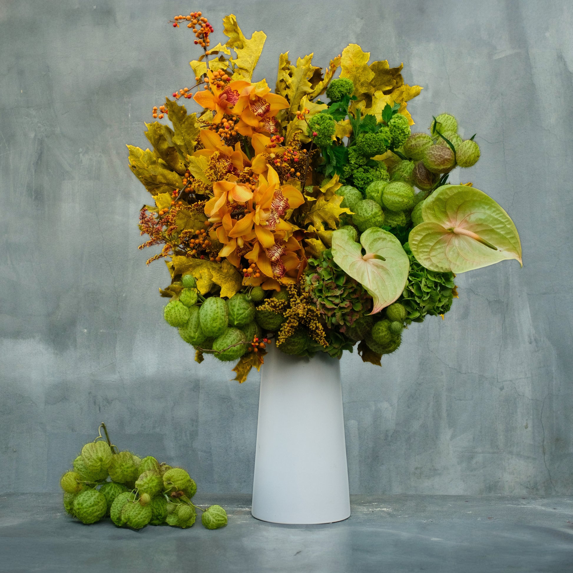 Vibrant, textural, and full of movement, Golden Grove captures the wild elegance of autumn’s shifting landscape. Designed in a tall, modern white vessel, this arrangement pairs Cymbidium Orchids, Anthurium, and bunches of Balloon Milkweed, with accents of fall oak foliage and bittersweet berries for a bold, sculptural finish.