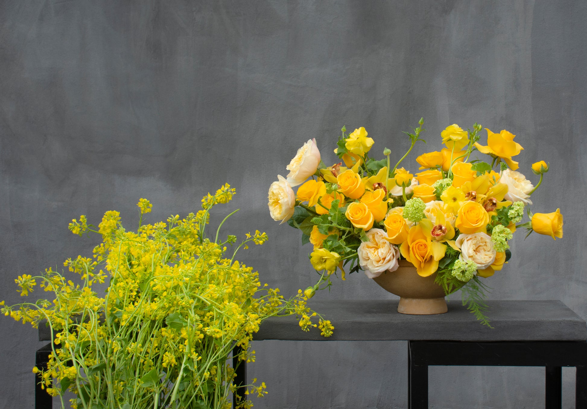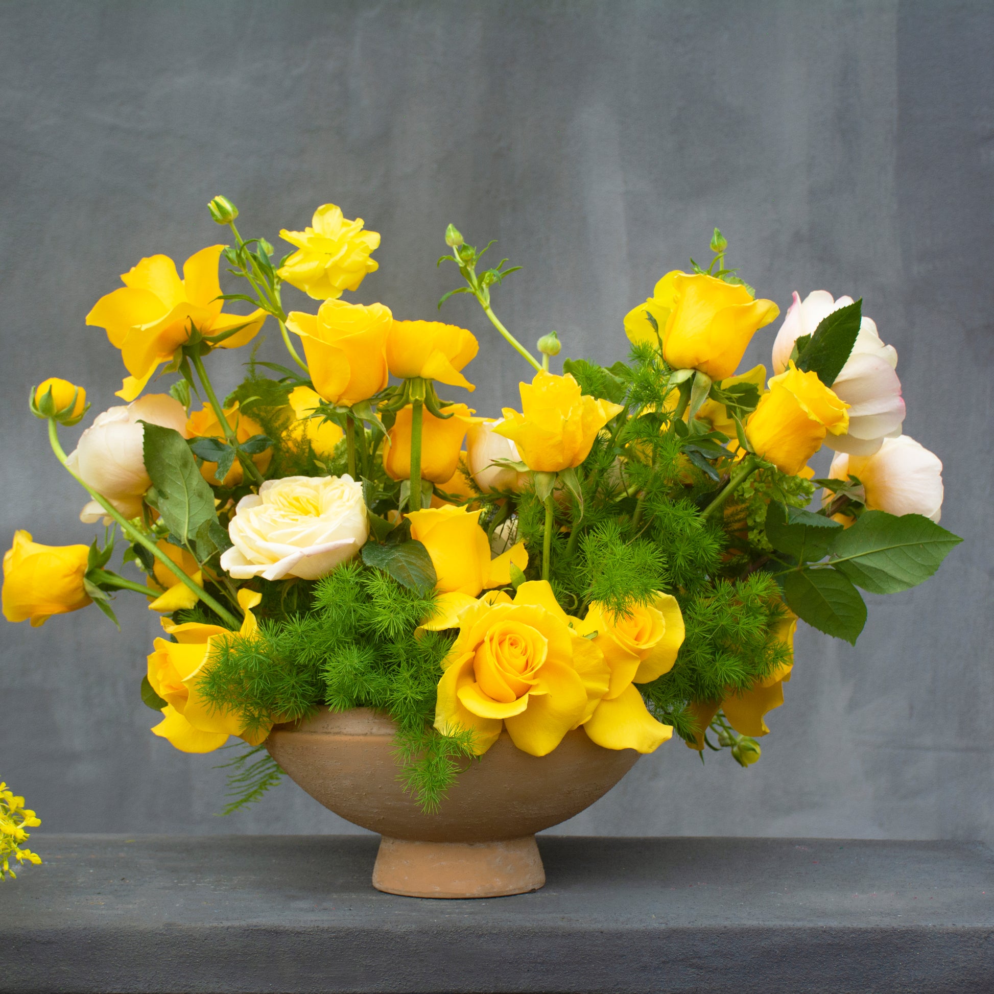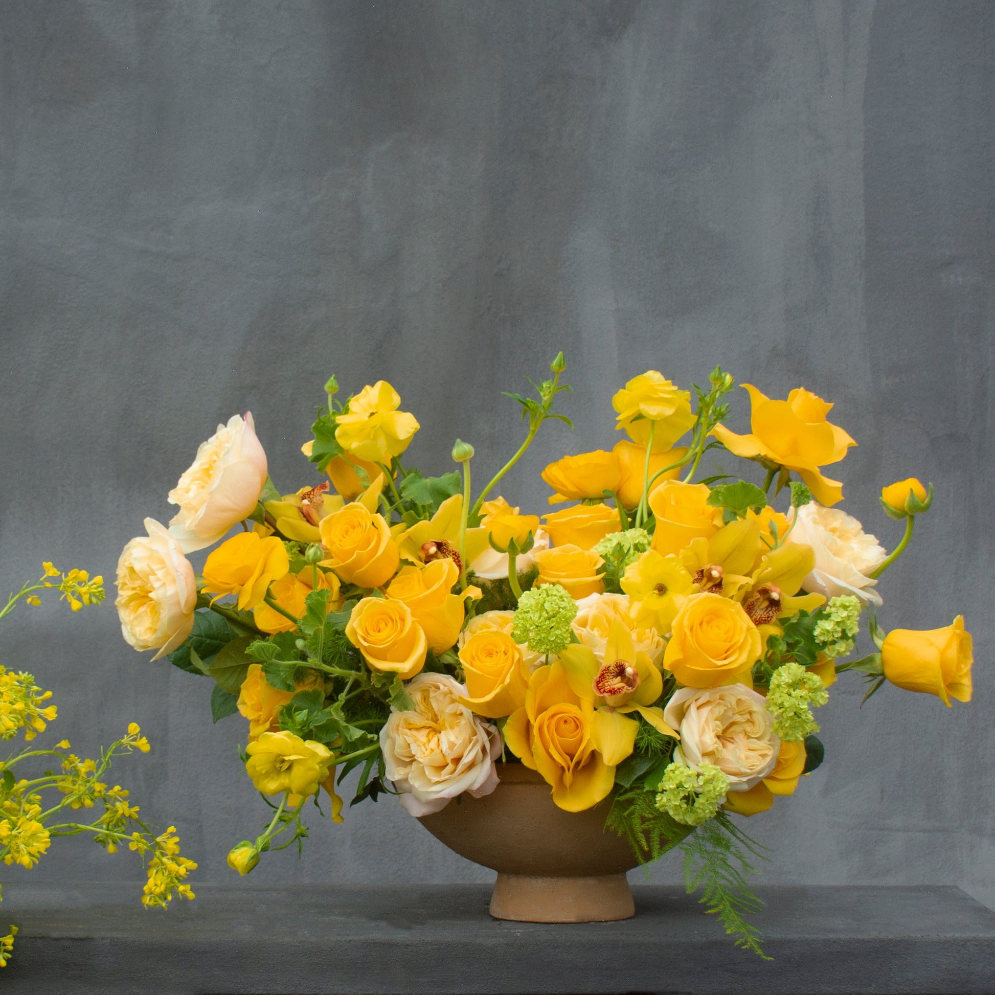 Bask in the radiant glow of Golden Hour—a stunning all-yellow arrangement that captures the warmth of sunshine and the joy of new beginnings. Bright yellow roses, delicate Austin garden roses, and fluttering butterfly ranunculus bloom alongside exotic cymbidium orchids, creating a luminous display of elegance. Fresh green viburnum, ming fern, and trailing ivy add a touch of natural movement, grounding the golden hues in effortless beauty. Designed in a graceful pedestal vase, this arrangement is a statement of light, happiness, and timeless charm.